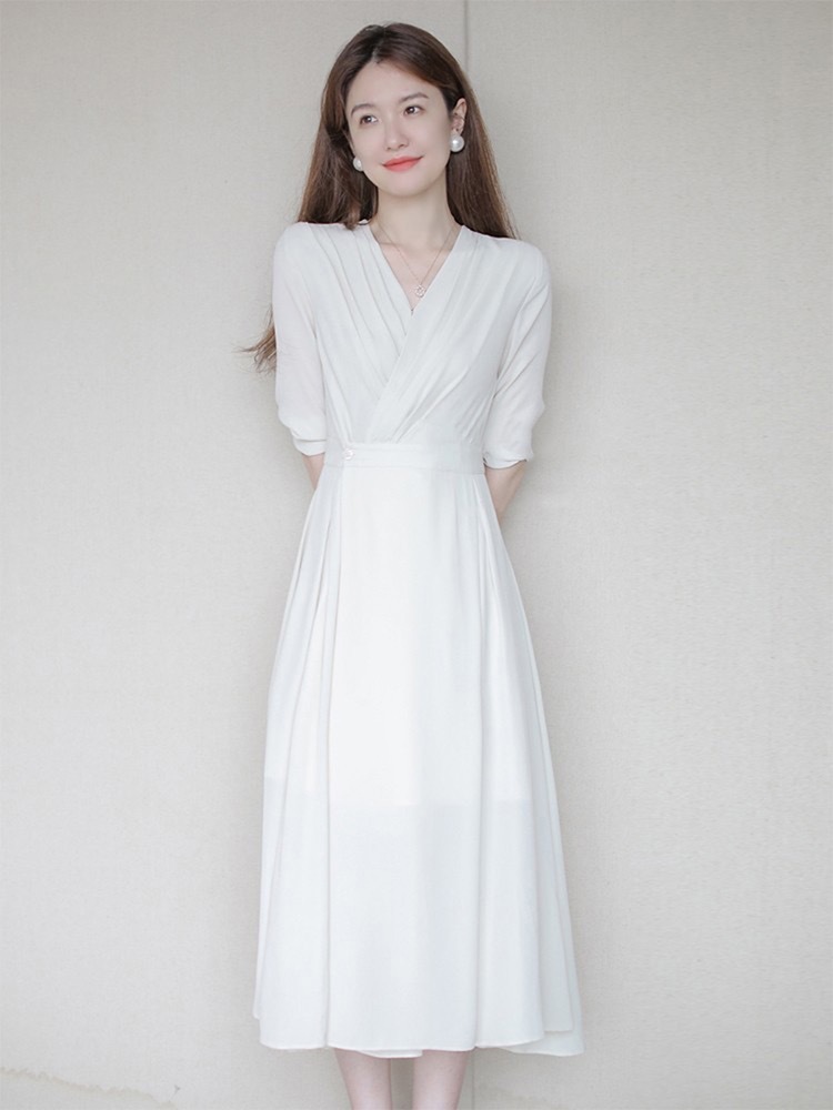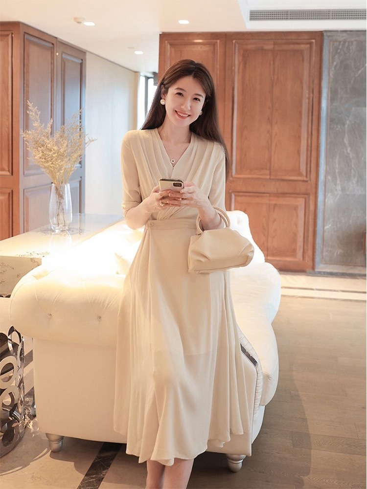 フレンチ 高級感 セレブ風 Vネック 無地 ワンピース エレガント 上品 ウエストマーク Aライン スカート