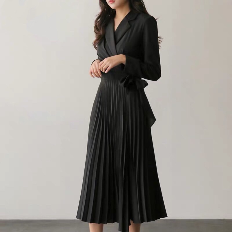 chic フレンチ ターンカラー デザイン性 上品 ミモレ丈 リボン ウエストマーク スタイルアップ プリーツ 大振りスカート