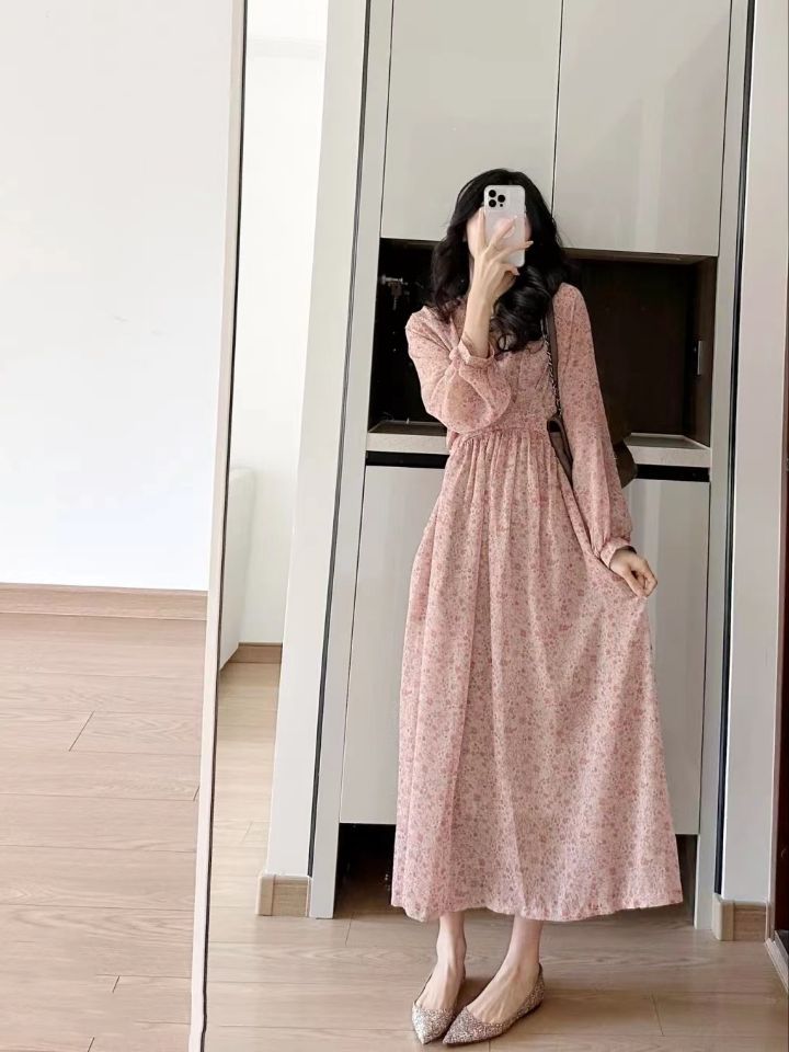 FAERIE2025 春先 レディース フレンチ 高級感 スタイルアップ ロング丈 フェアリー ピンク 小花柄 ワンピース