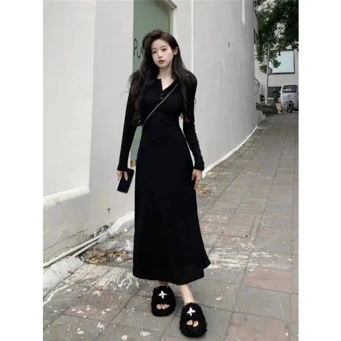 (Kizoo)セクシー グレー長袖 ニットワンピース 秋 新作 ウエスト引き締め ロング丈 インナーワンピース レディース ニット