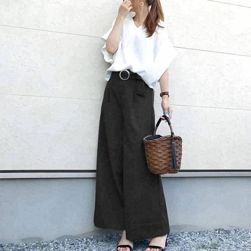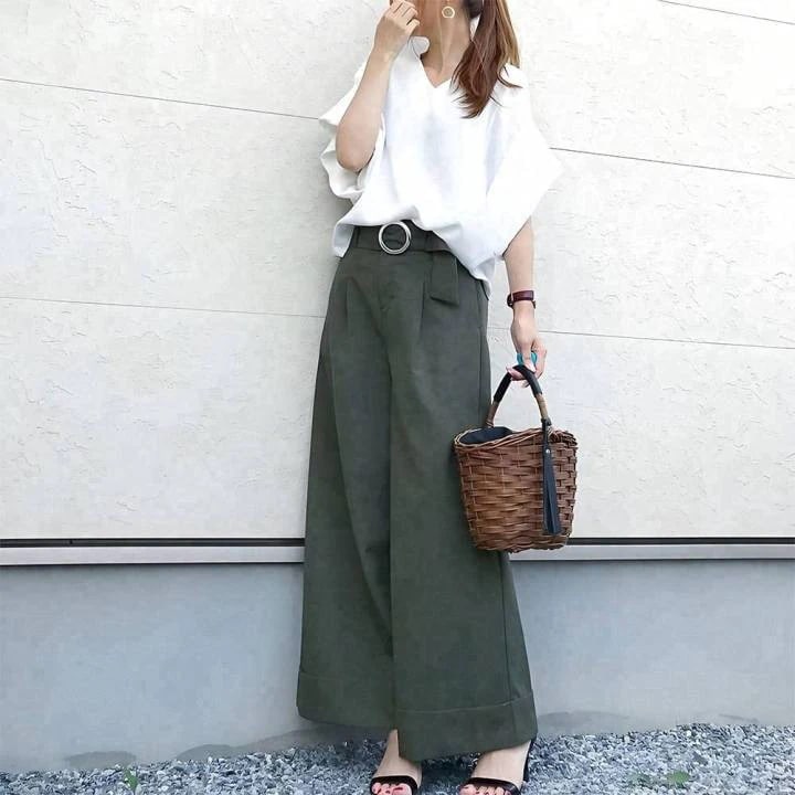 Vネックトップス+ベルト付きワイドパンツ