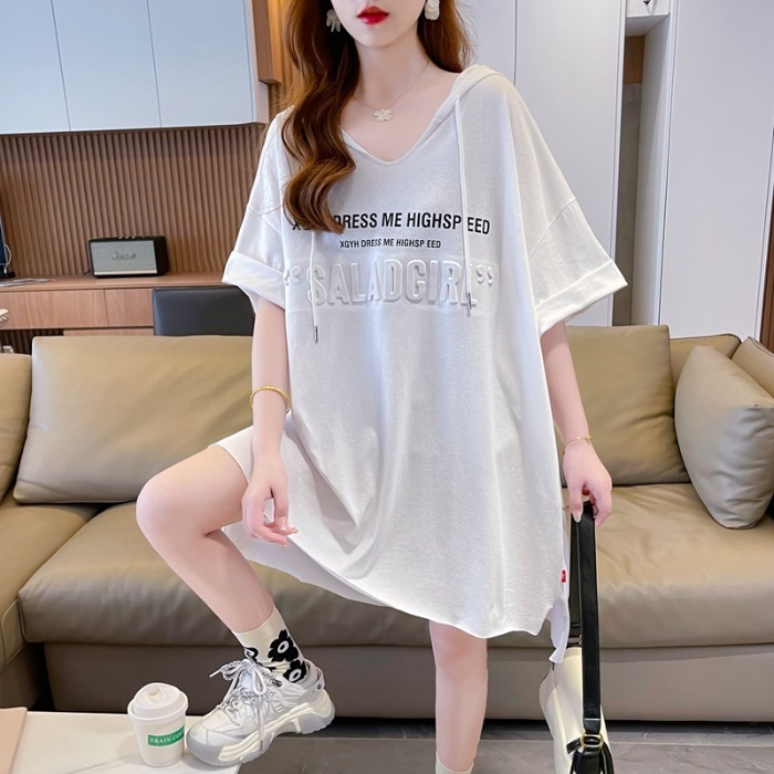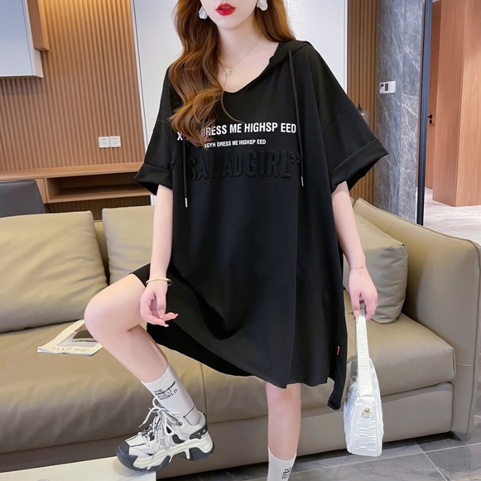 大きいサイズ tシャツ レディース セミロング体型カバー 半袖 シャツ 韓国ファッション フード付き トップス半袖 パーカー 怠惰な風 ゆったり カジュアル Tシャツ/ブラウス