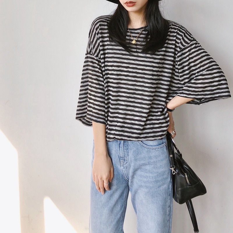 夏 新作 ストライプ tシャツ レディース ゆったり ドロップスリーブ 半袖 Tシャツ 日韓国ファッション 半袖 トップス 快適 百掛けシャツ /ブラウス