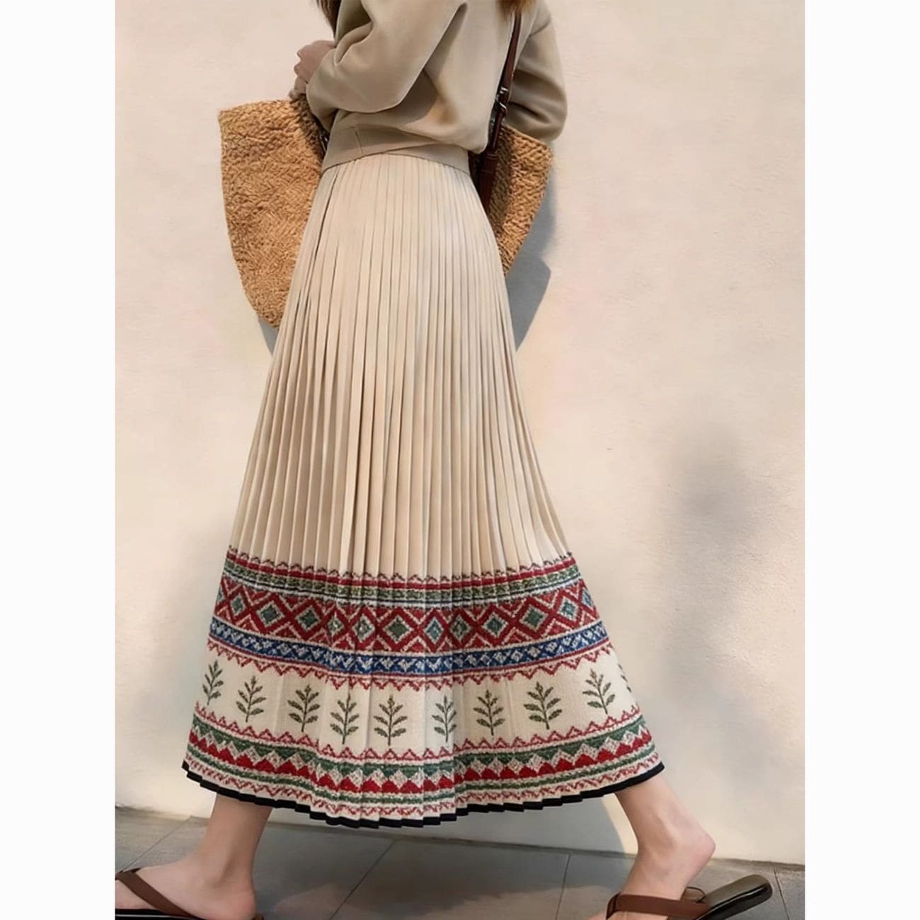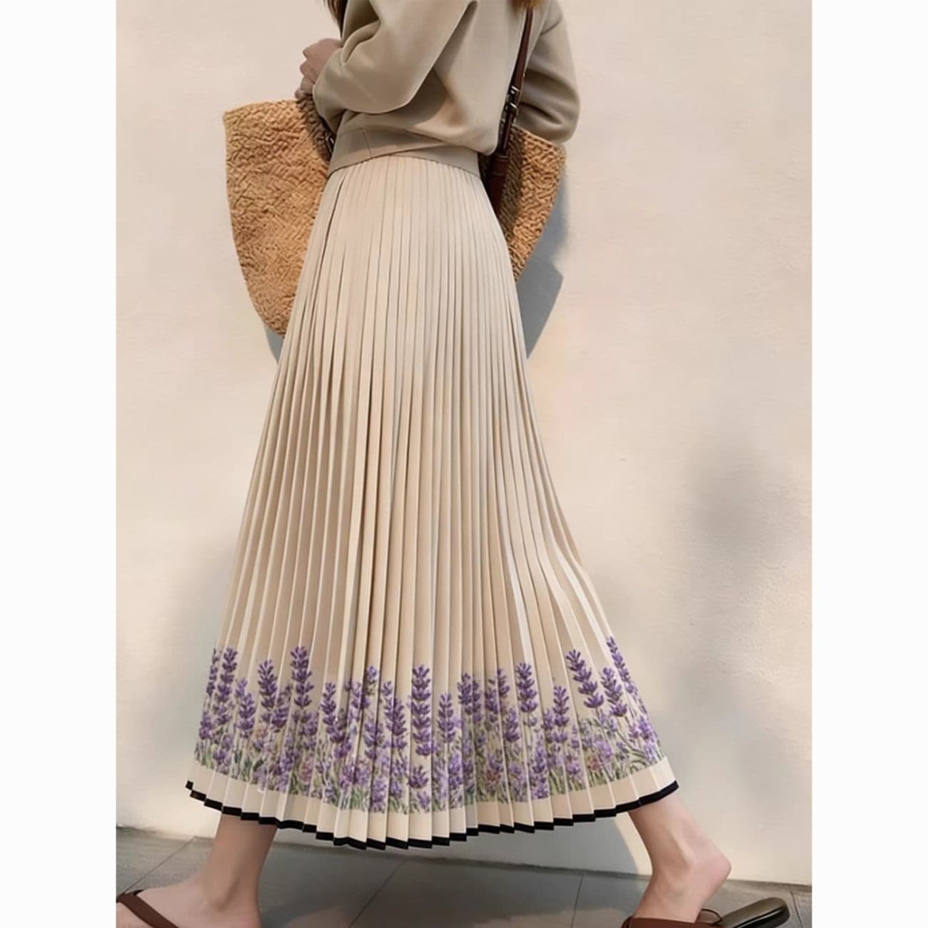 エスニック風 ハイウエスト ロング丈 花柄プリント スタイルアップ 着痩せ 通勤 きれいめ エレガント プリーツスカート ウエストゴム 伸縮性 合わせやすい デイリー使い デート お出かけ