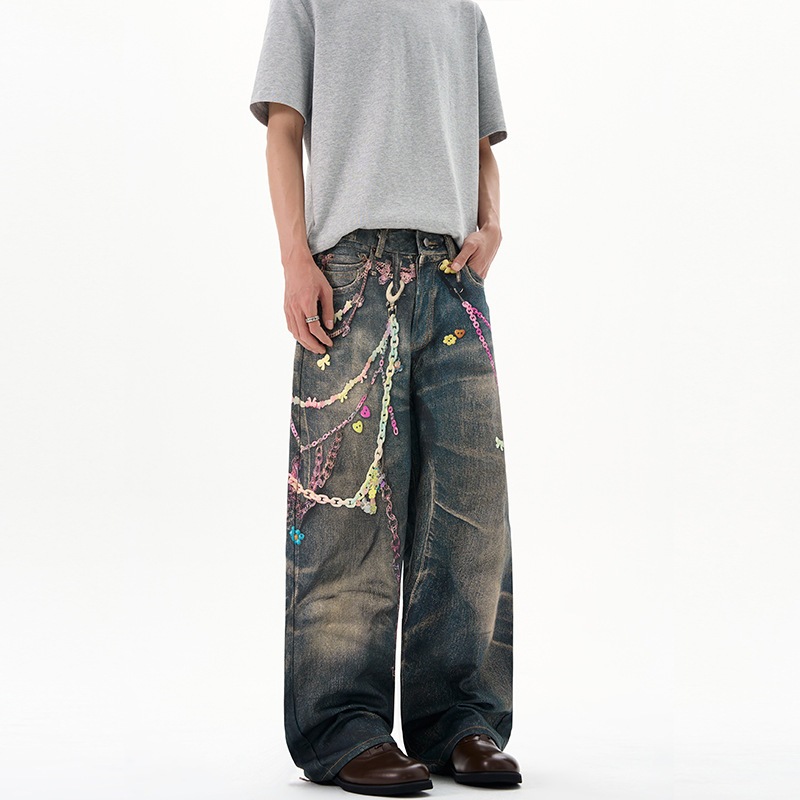 アメリカン レトロ キャンディーチェーン 3D 錯視 プリント ジーンズ 男女兼用 ゆったり スタイルアップ ストレートパンツ