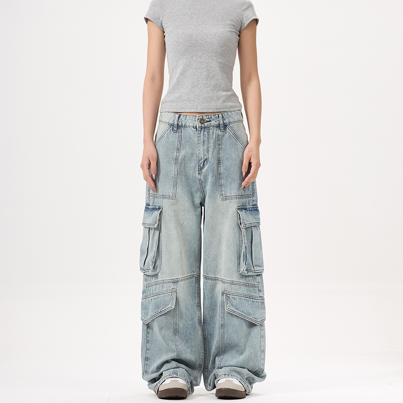 アメリカン レトロ ブランド ウォッシュ ヘビーウェイト ライトカラー カーゴ ジーンズ 男女兼用 ゆったり ワイド ロングパンツ