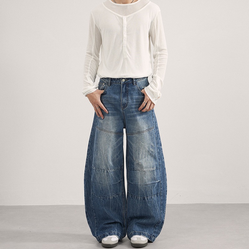 アメリカン ウォッシュ ライトニング 模様 カーブジーンズ 男女兼用 ブランド ゆったり オーバーサイズ リラックス感 ロングパンツ