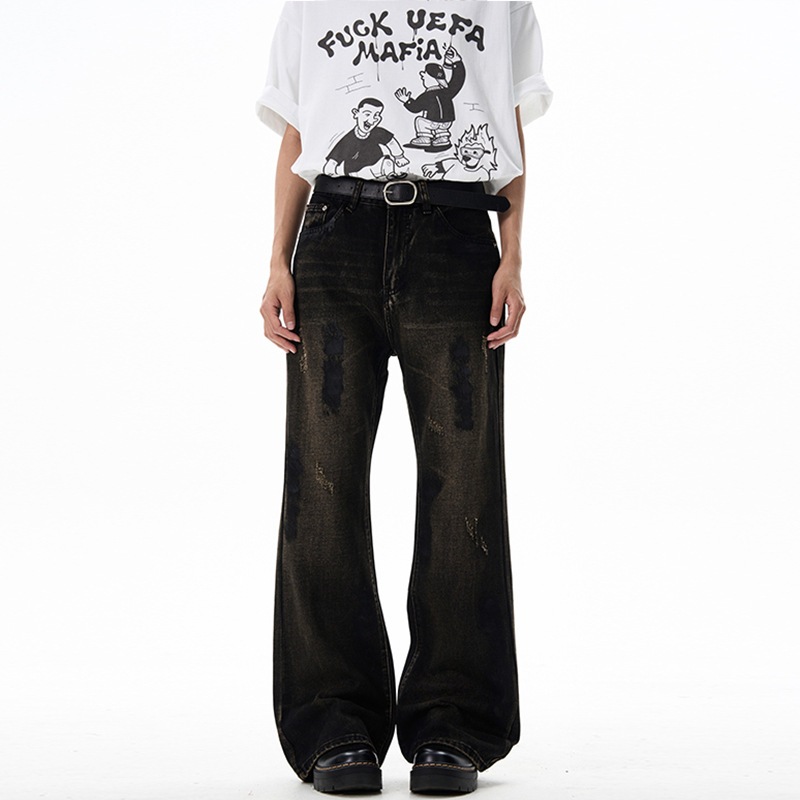 ハイストリートアメリカン ハイストリート ウォッシュ 加工 ブラックグレー ジーンズ 男女兼用 バイブ ブランド フレアパンツ