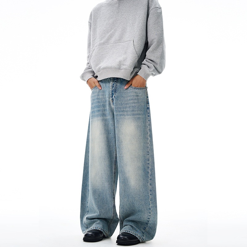 アメリカン シンプル ウォッシュ ホワイトヒゲ カーブジーンズ 男女兼用 バギー スタイルアップ カジュアル ワイド ロングパンツ