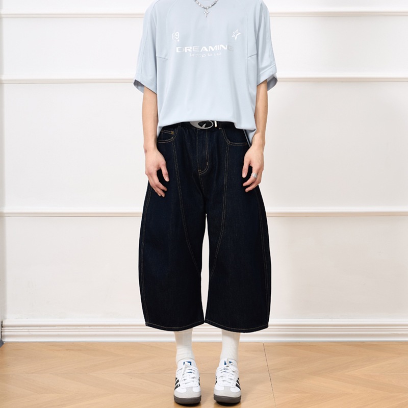 アメリカン ウォッシュ インディゴ カーブ 七分丈 ジーンズ 男女兼用 ブランド オーバーサイズ ショートパンツ