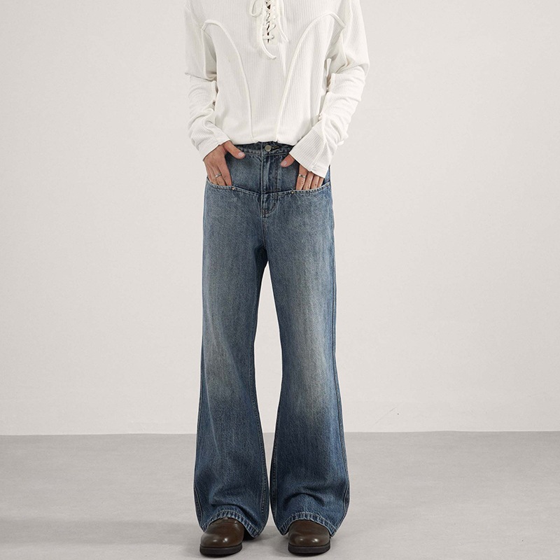 アメリカン レトロ インサイドポケット デザイン 竹節 ジーンズ 男女兼用 ブランド スタイルアップ カジュアル フレア ロングパンツ