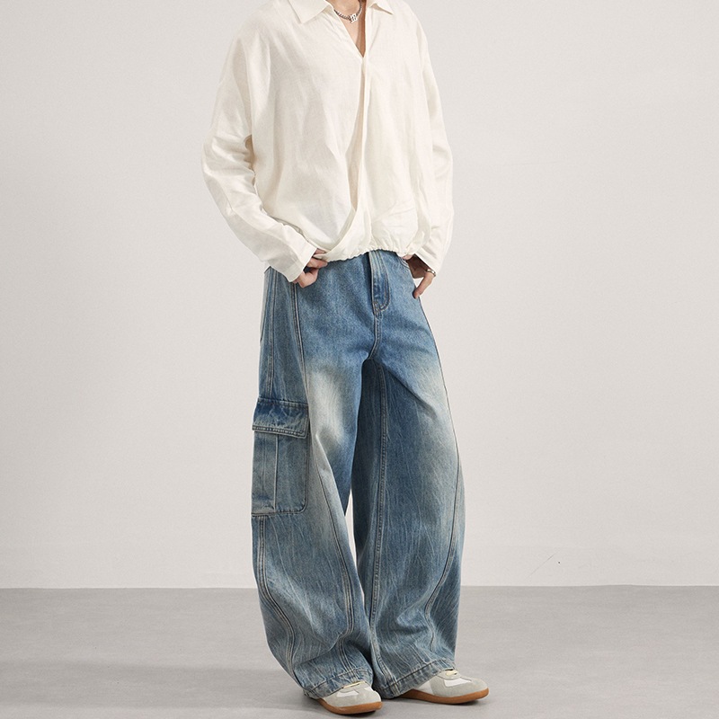 アメリカン オーバーサイズ カーブ デニム ロングパンツ 男女兼用 ブランド デザイン性 ビッグポケット カーゴパンツ