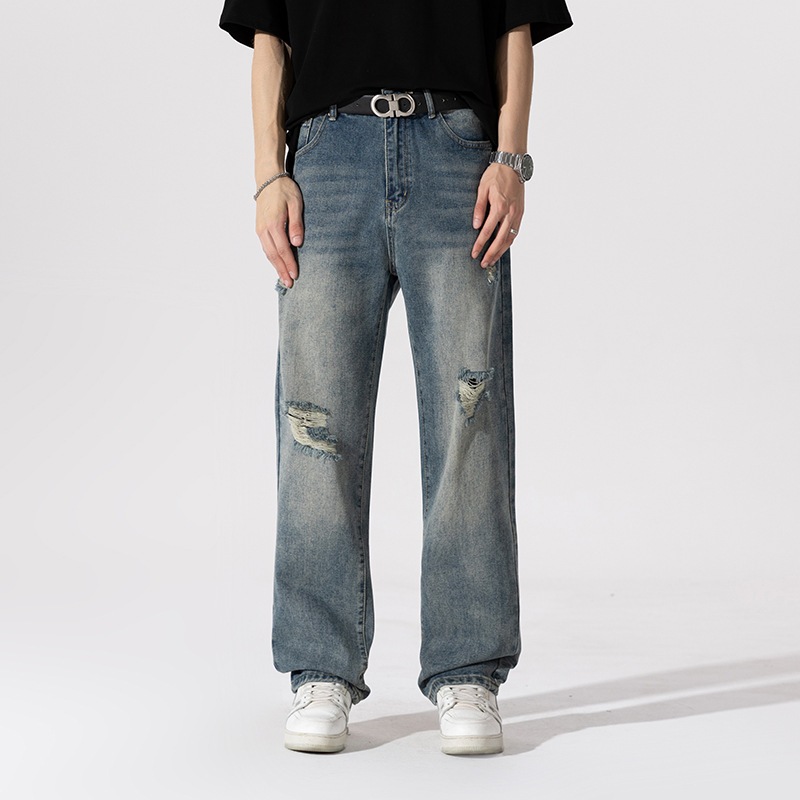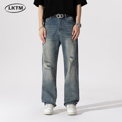 ホール ジーンズ メンズ インスタ映え アメリカン ストリート系 レトロ ウォッシュ 加工 ストレート ロングパンツ