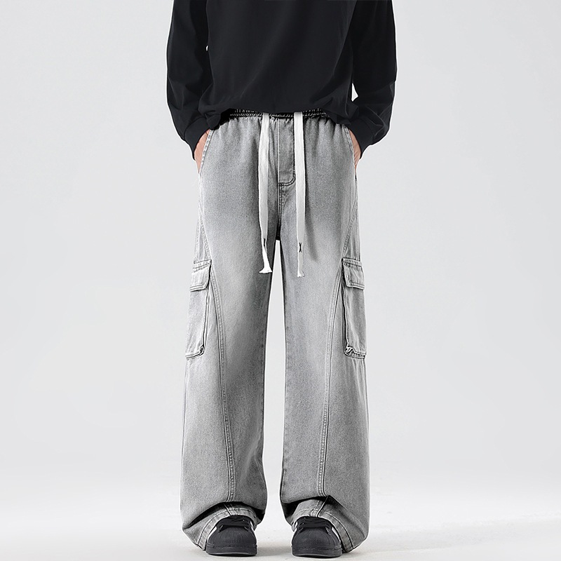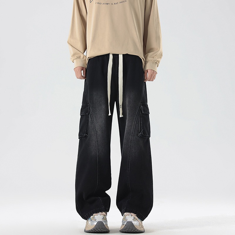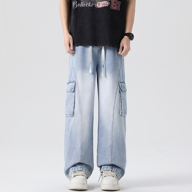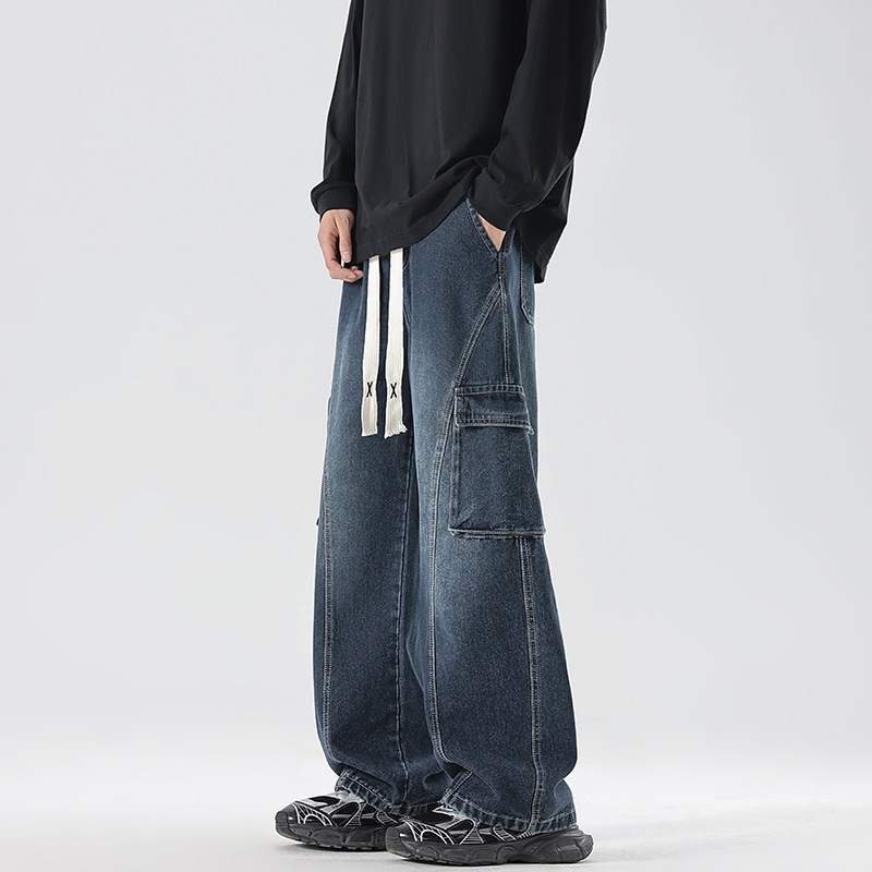 アメリカン レトロ アーチカット マルチポケット カーゴパンツ メンズ インスタ映え ブランド ゆったり ドローコード ジーンズ