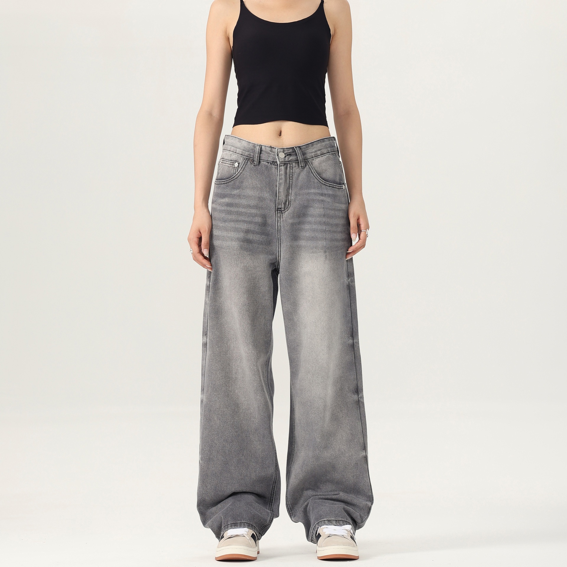 アメリカン 加工 ホワイトヒゲ グレー ジーンズ 男女兼用 cleanfit ワイド 引きずるパンツ