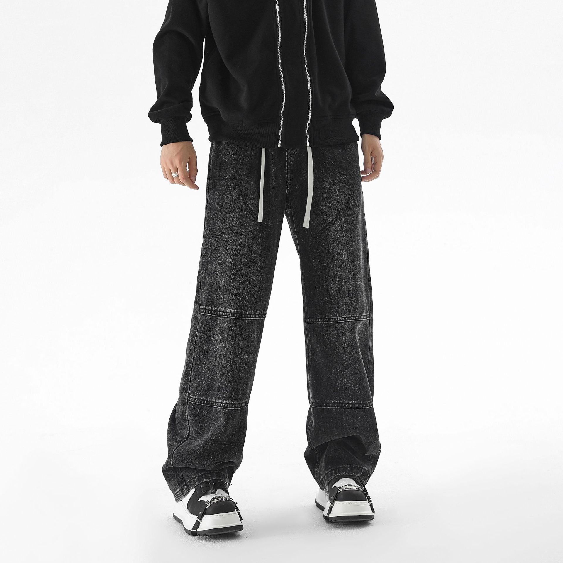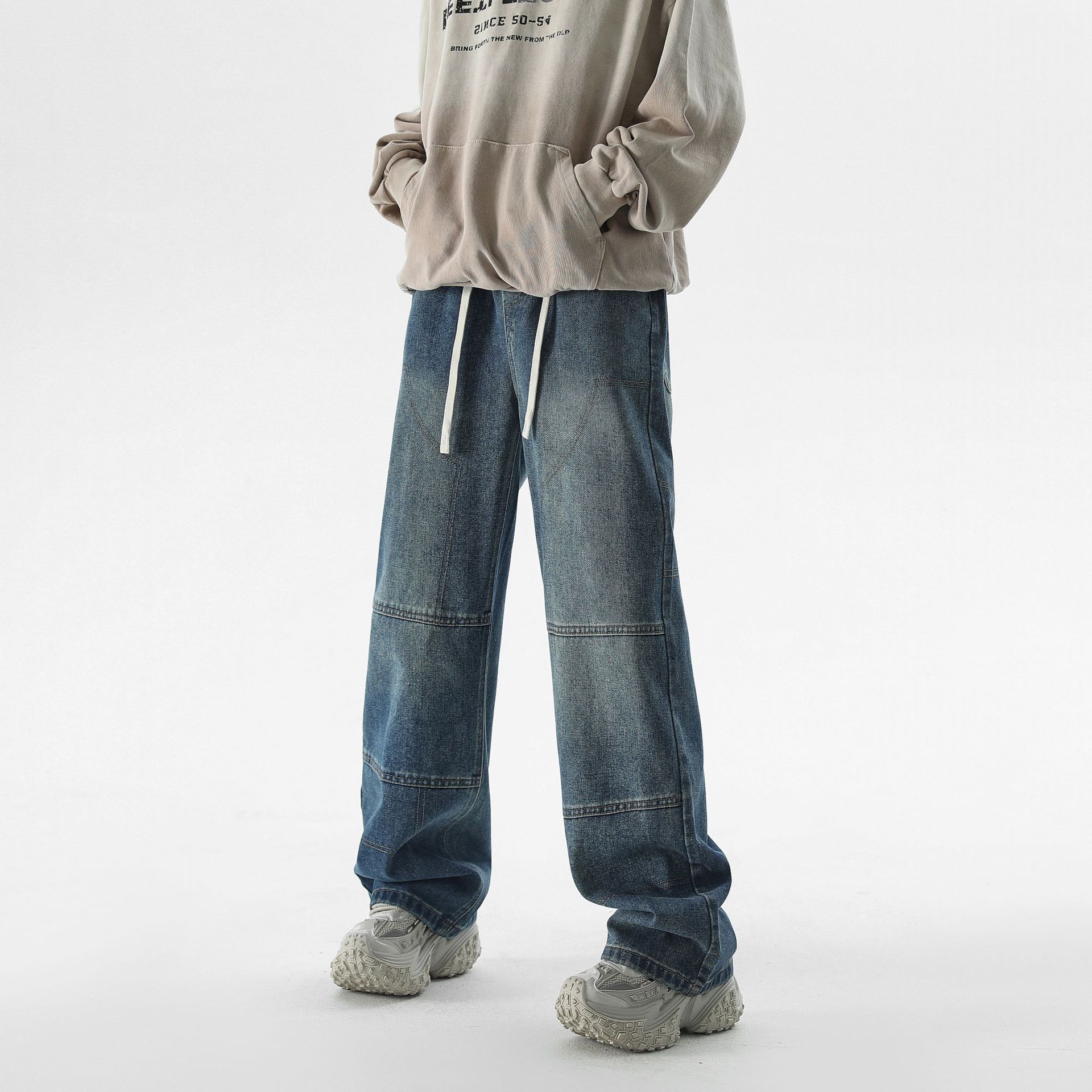 アメリカン ストリート 個性的 パッチワーク デザイン性 ジーンズ メンズブランド ゆったり ドローコード ストレート ロングパンツ