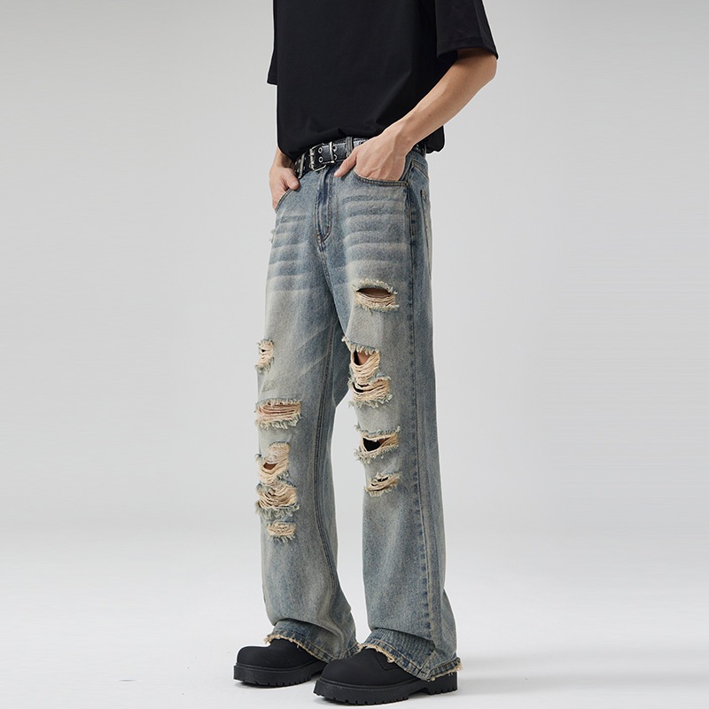 ハイストリートアメリカン ハイストリート ヒップホップ 加工 ヘビーウェイト ホール ジーンズ 男女兼用 ゆったり スタイルアップ フレアパンツ