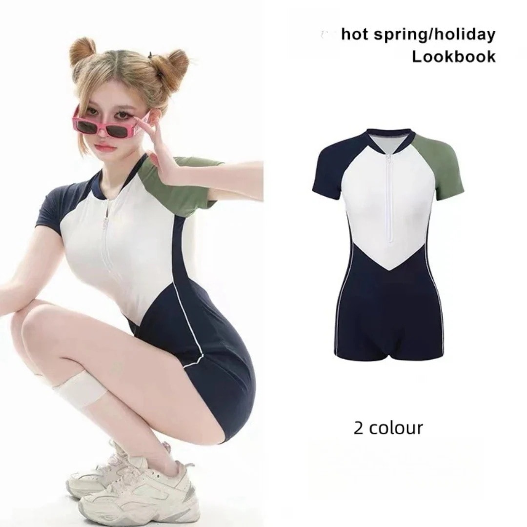 韓国ファッション 気沸騰水着 水着 新しいスタイル学生ボクサースポーツワンピース水着女性温泉半袖スリム水着 激安水着 体型カバー