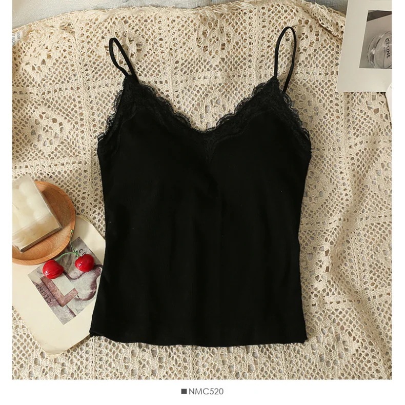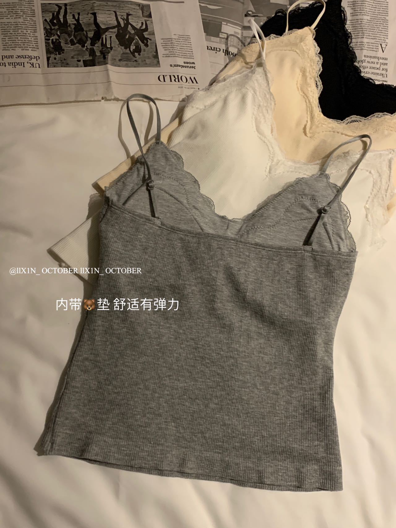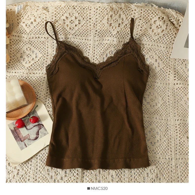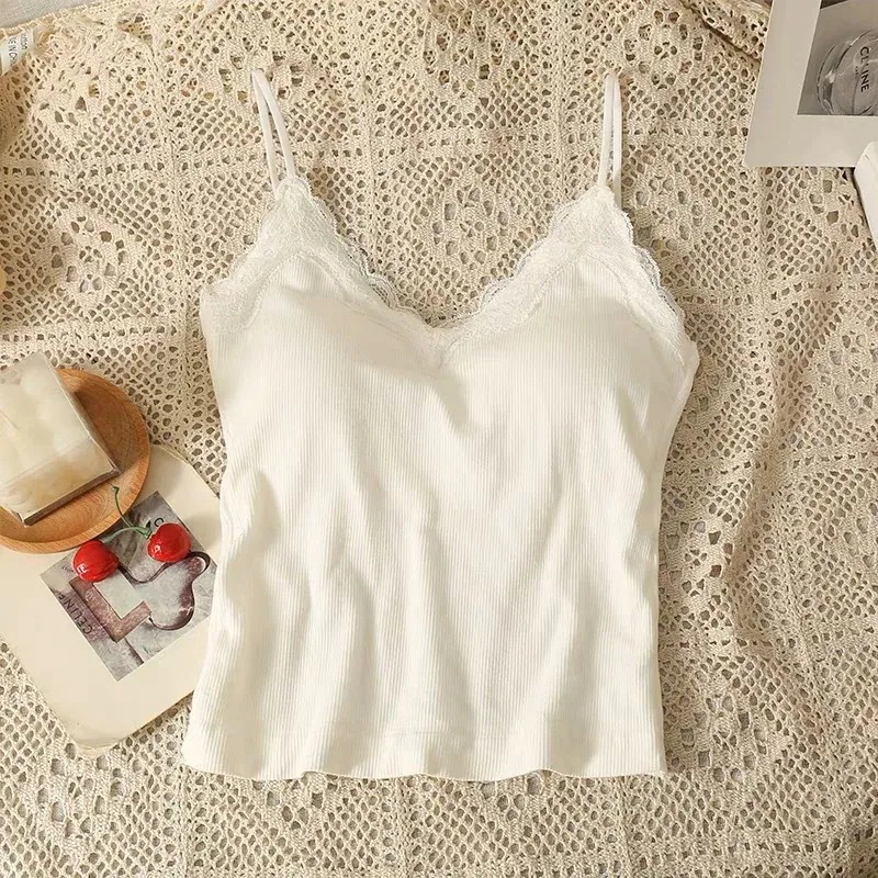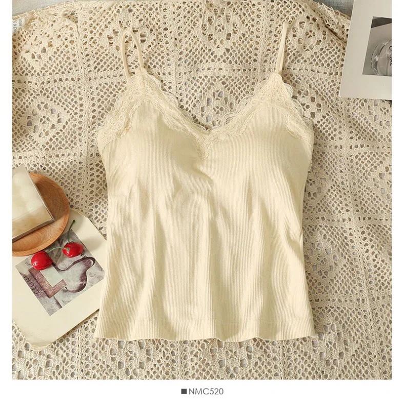 固定カップ シームレス Vネックブラトップ 胸パッド付き レース ストラップレスタンクトップ