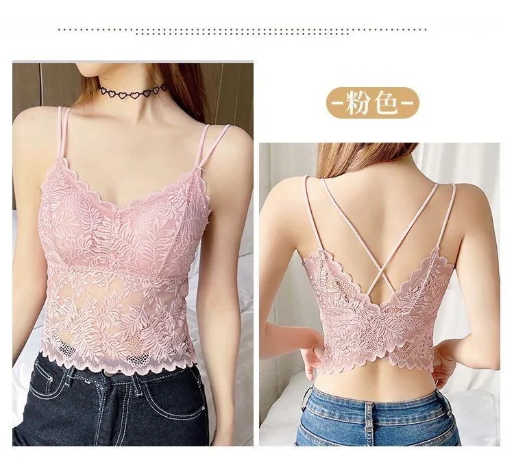 ノーライン ブラジャーパッド付き レース 薄手 ストラップ Vネックブラトップ