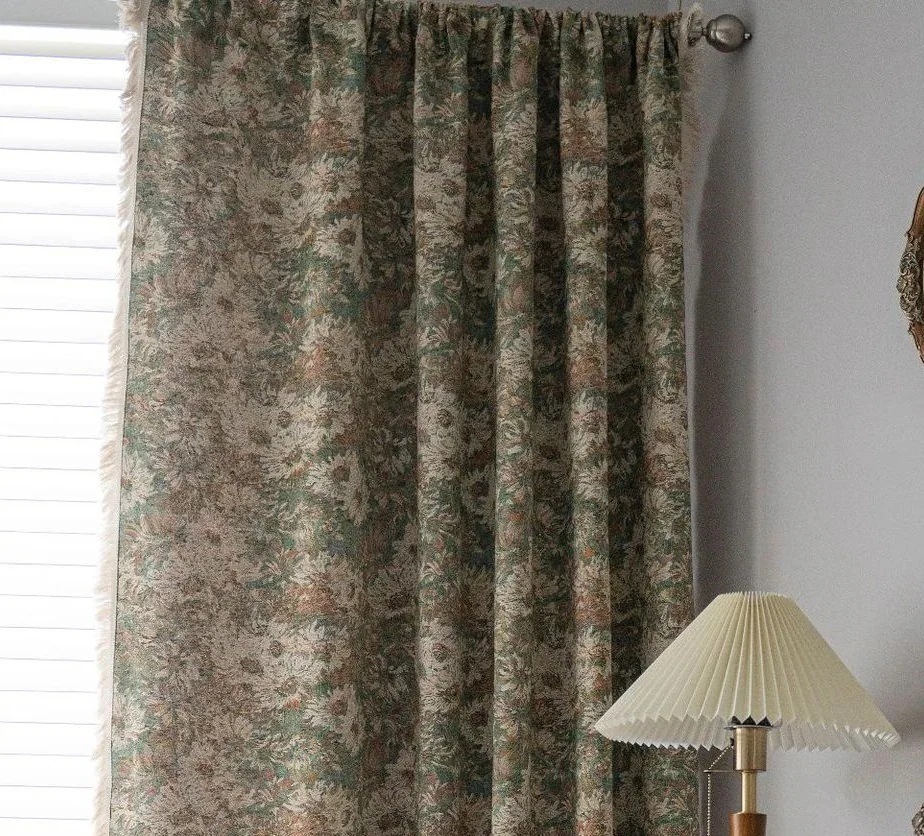 芸術的なインテリア-花飾りカーテン白フリンジ緑油画雰囲気厚手のロマンチックのれんRomantic Curtain