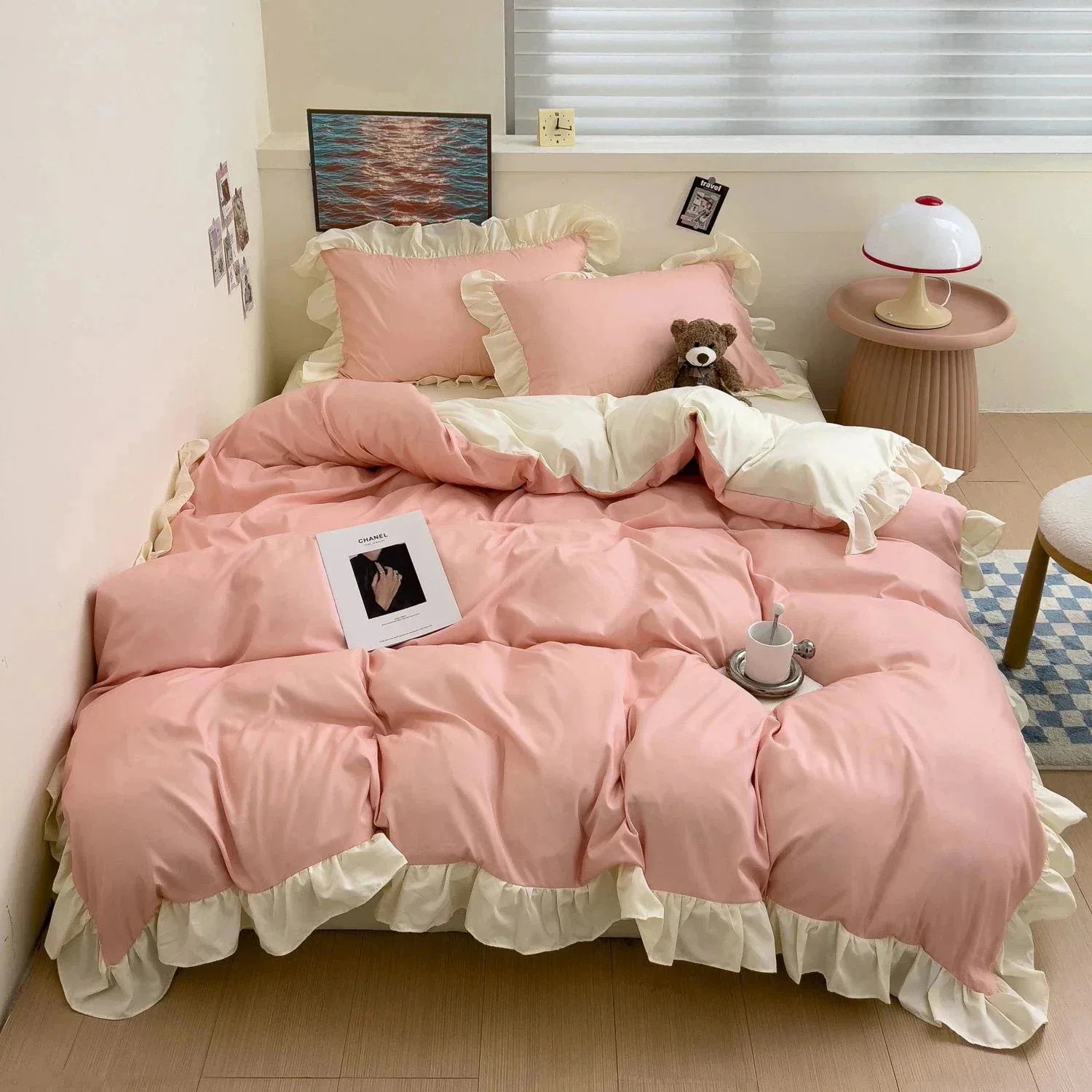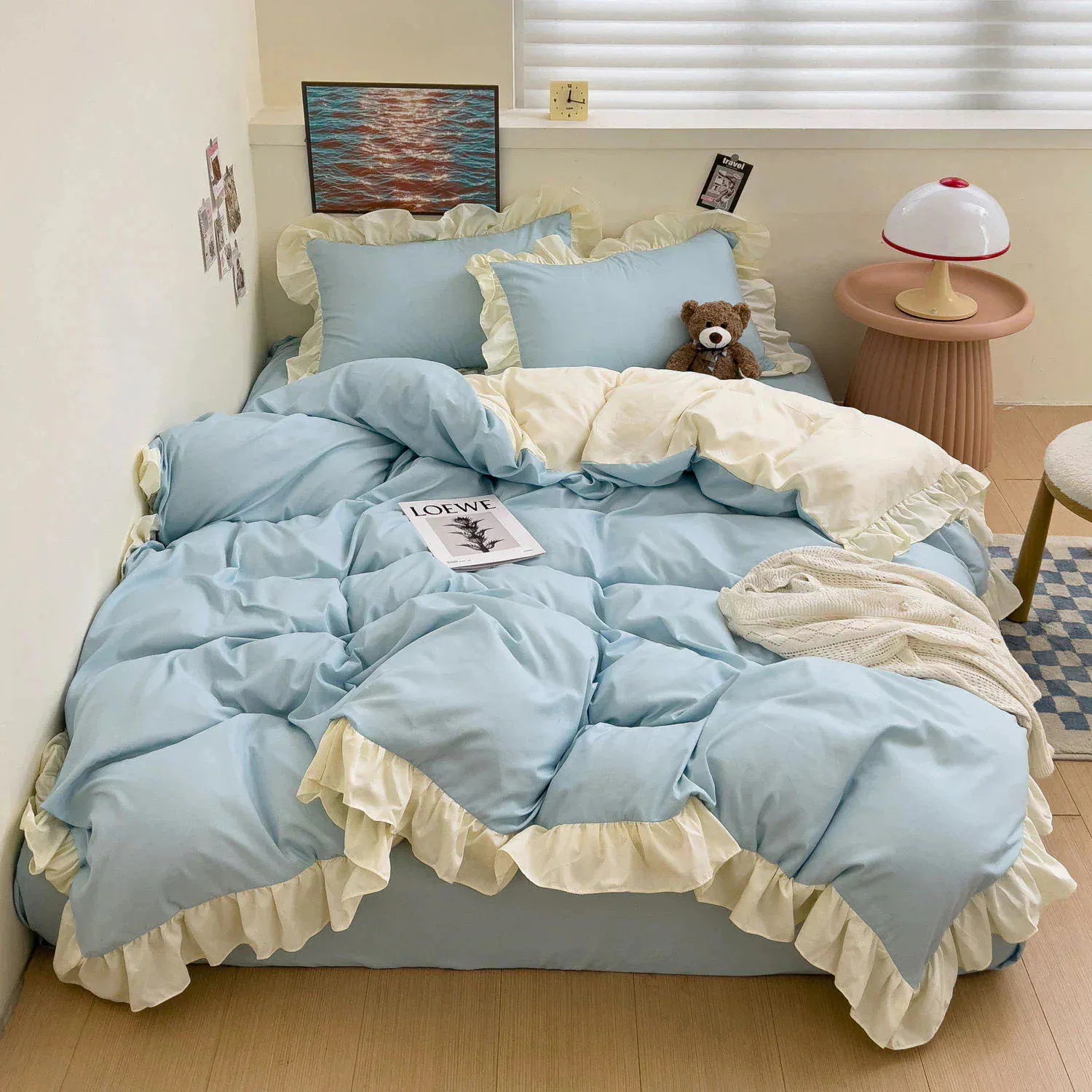 現品/店長おすすめ布団カバー ins風水洗綿クリーム4点セットプリンセス風レース布団カバーシーツ寮3点セット1.2m 寝具4点セット 韓国