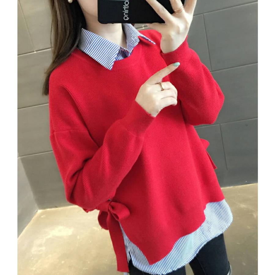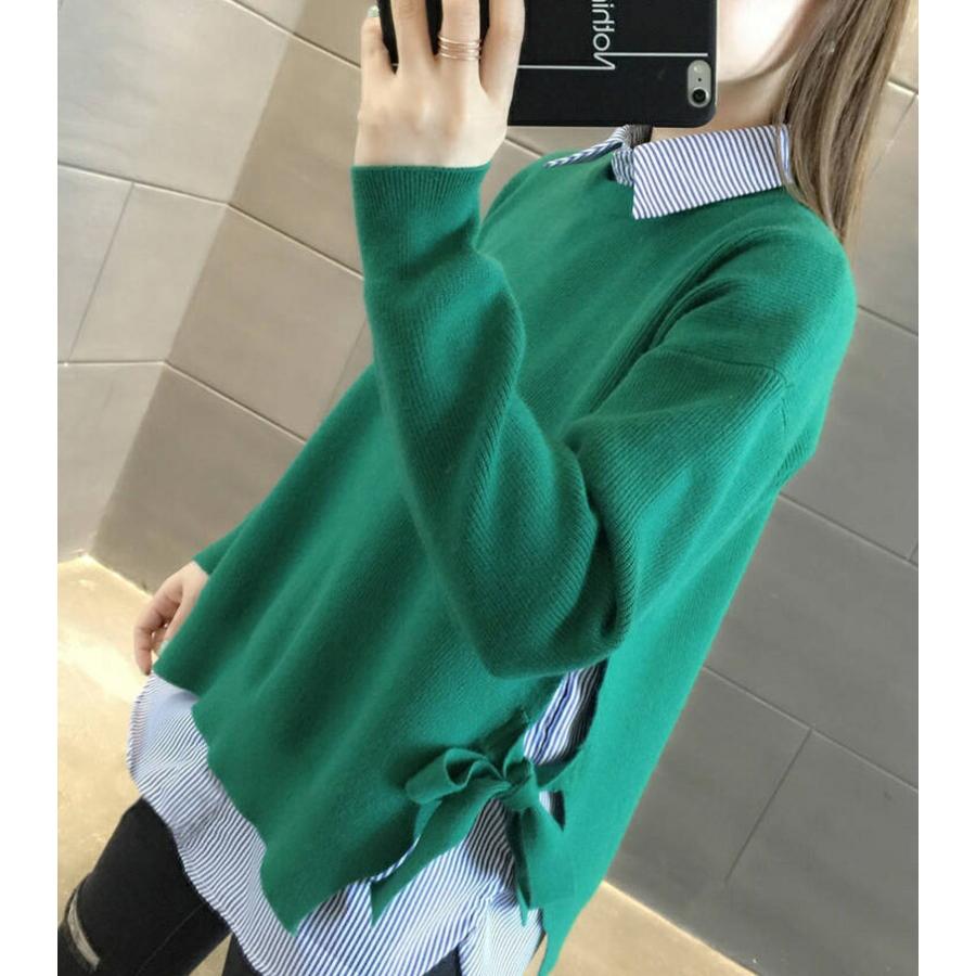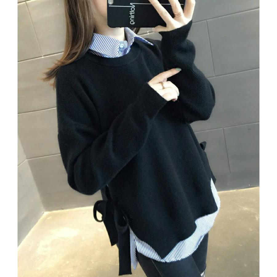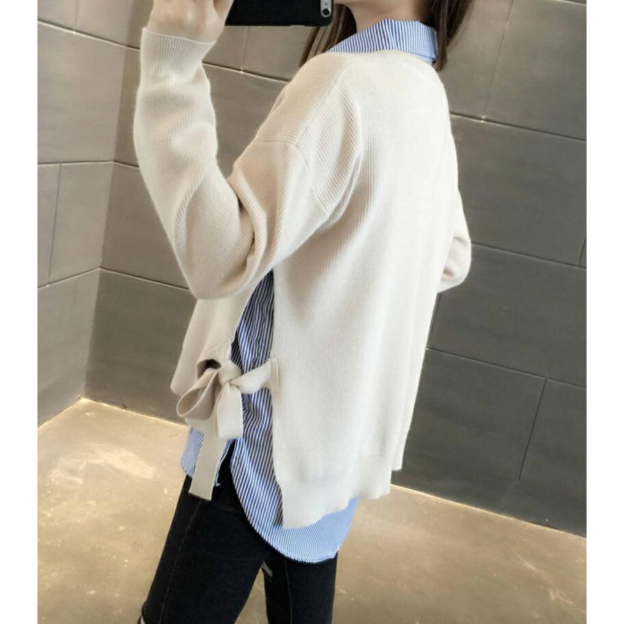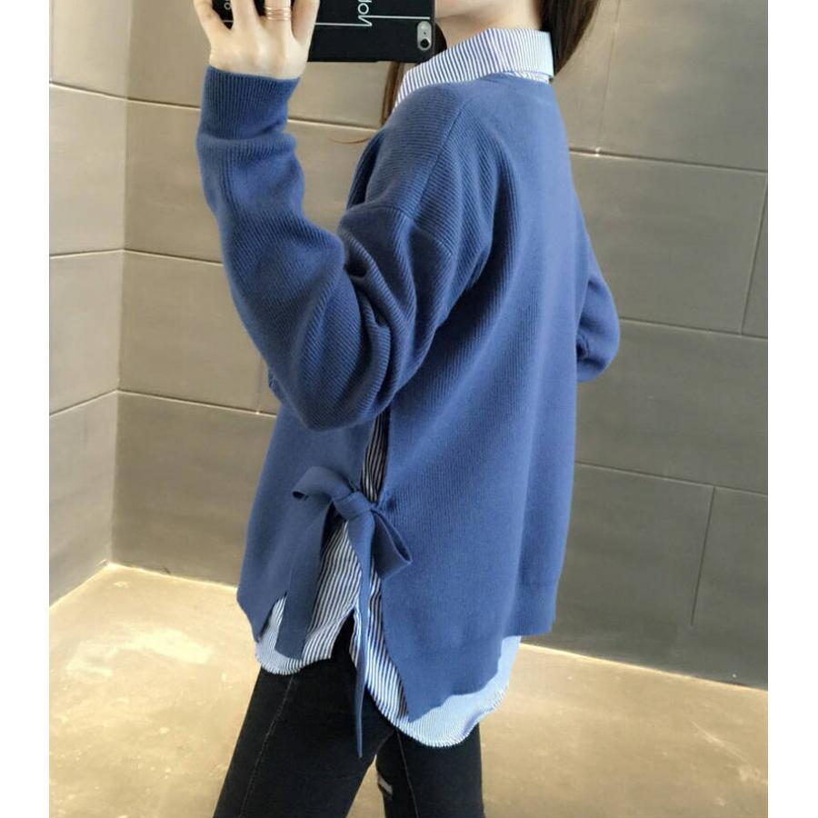 シャツ ニット レイヤード 重ね着風 長袖 ラウンドネック 丸首 2点セット 重ね着風ニット ストライプ 襟付き ニットセーター セットアップ オシャレ きれい 春秋