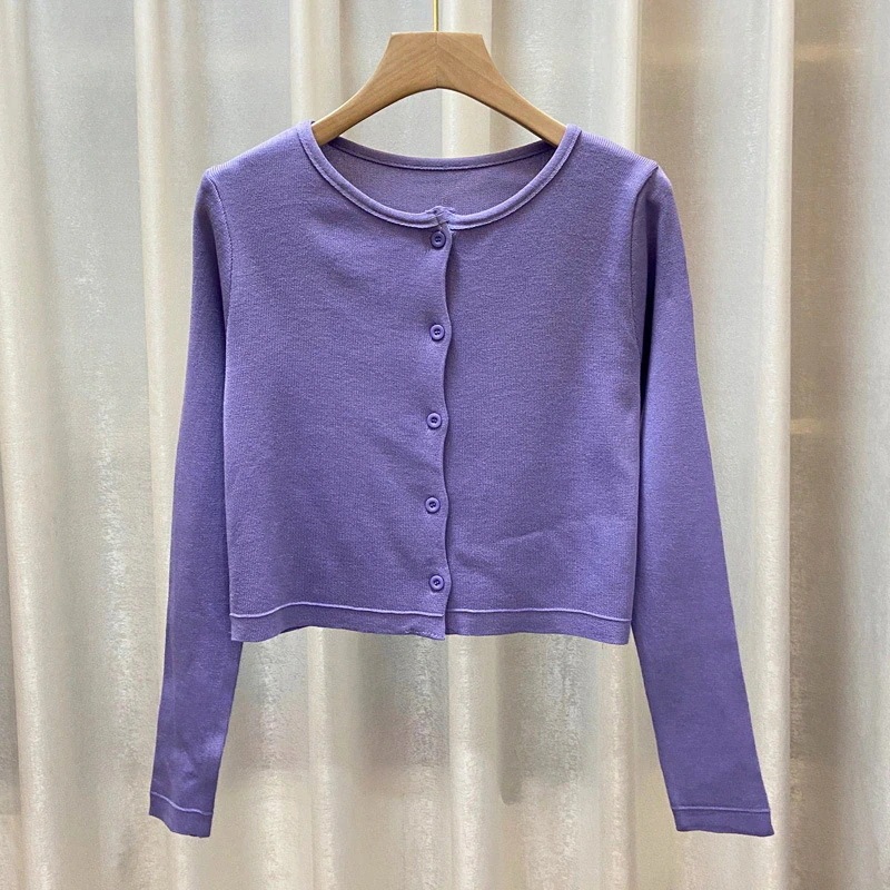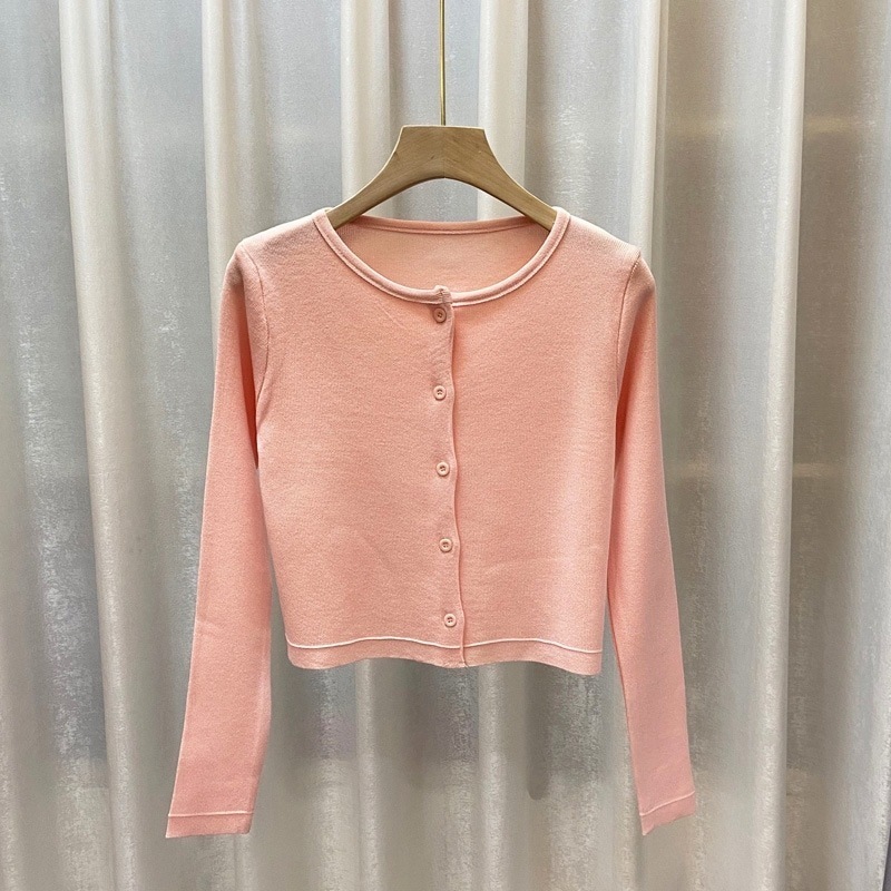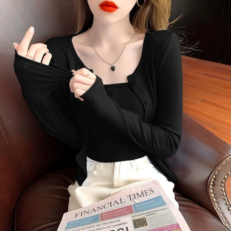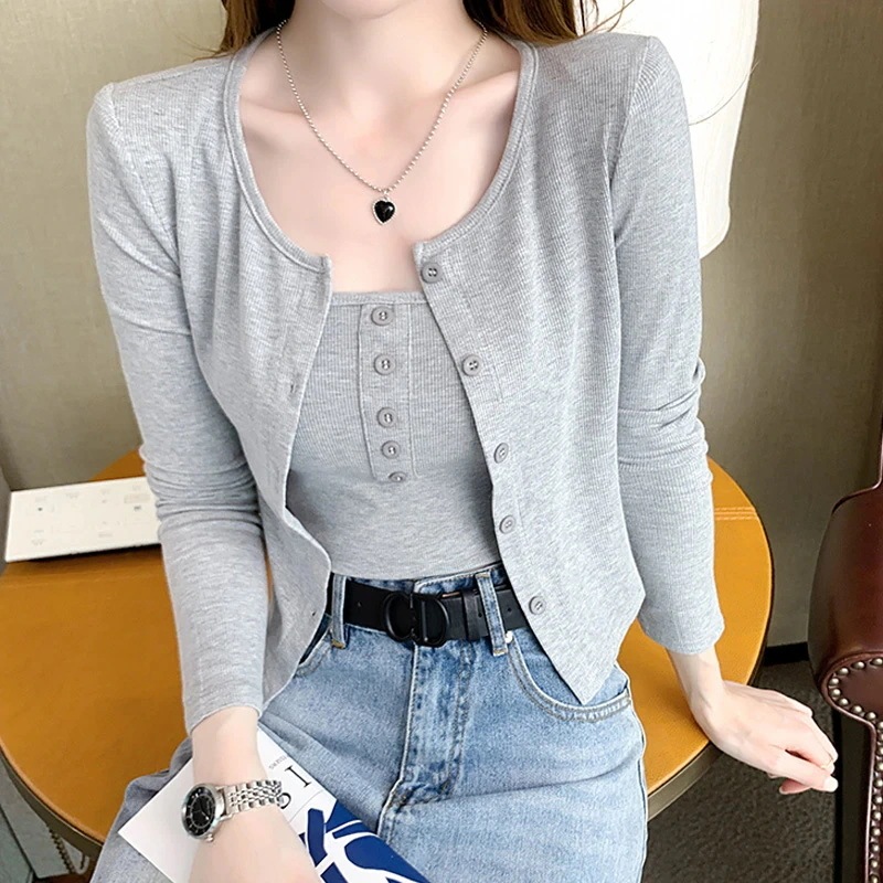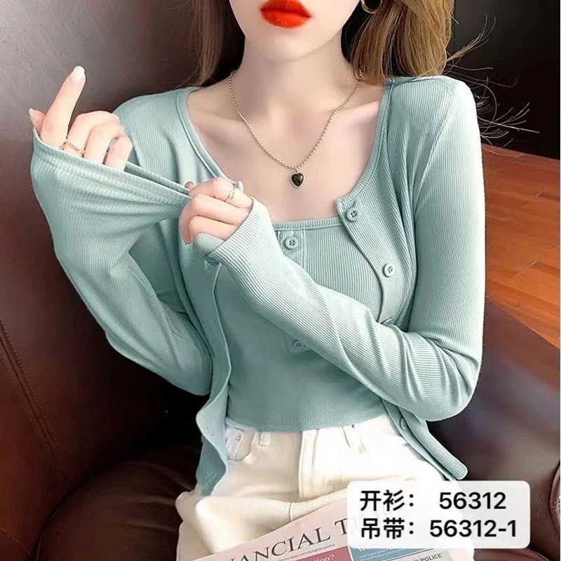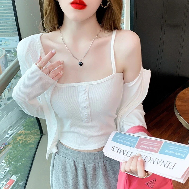 ベーシックニット カーディガン 早秋新作若返りオフショルダーストラップショート丈長袖ニットカーディガン2点セット 韓国ファッション
