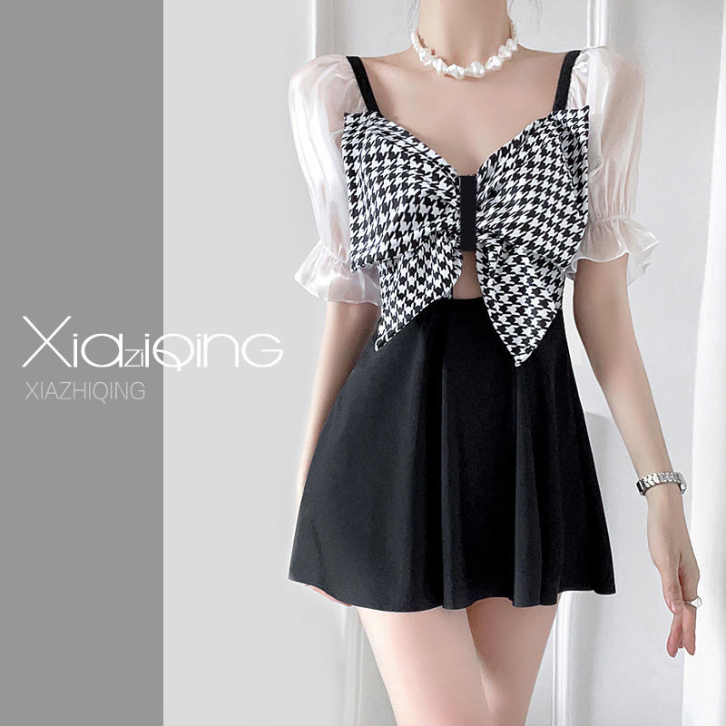 水着 韓千鳥格子可愛い蝶結びメッシュ保守着痩せ海边休暇温泉連結体です水着水陆两用