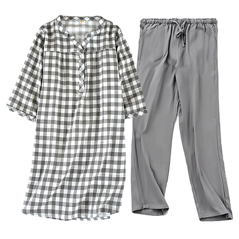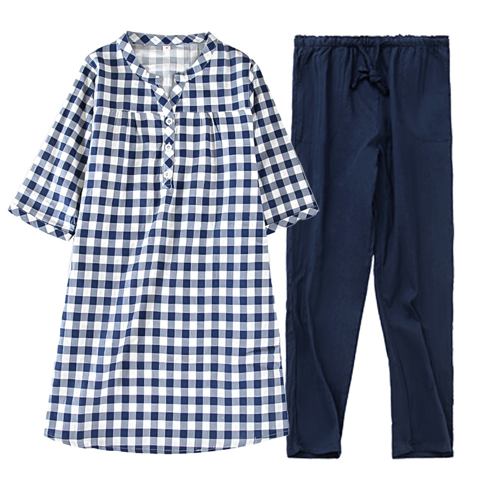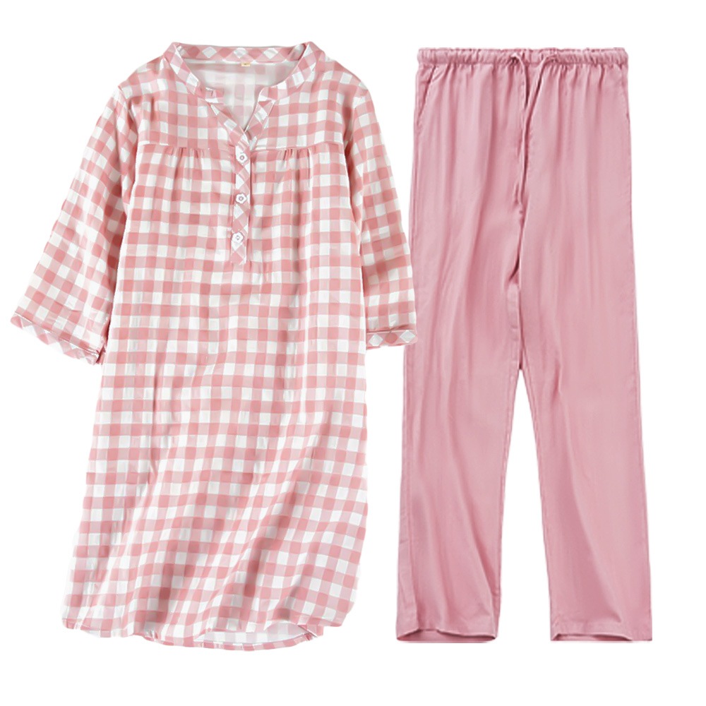 パジャマ レディース チュニック 7分袖 上下セット 綿100 チェック柄 ルームウェア 部屋着 体型カバー ワンピース 薄手 春夏秋 長ズボン コットン 女性用 pjm9