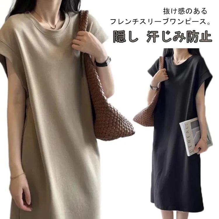 ワンピース フレンチスリーブ 脇見え防止 Tシャツワンピース 脇見え 防止 隠し 汗じみ防止 ノースリーブ ミモレ丈 tシャツワンピ ひざ下 ワンピース フレンチスリーブワンピース カットソー 送料