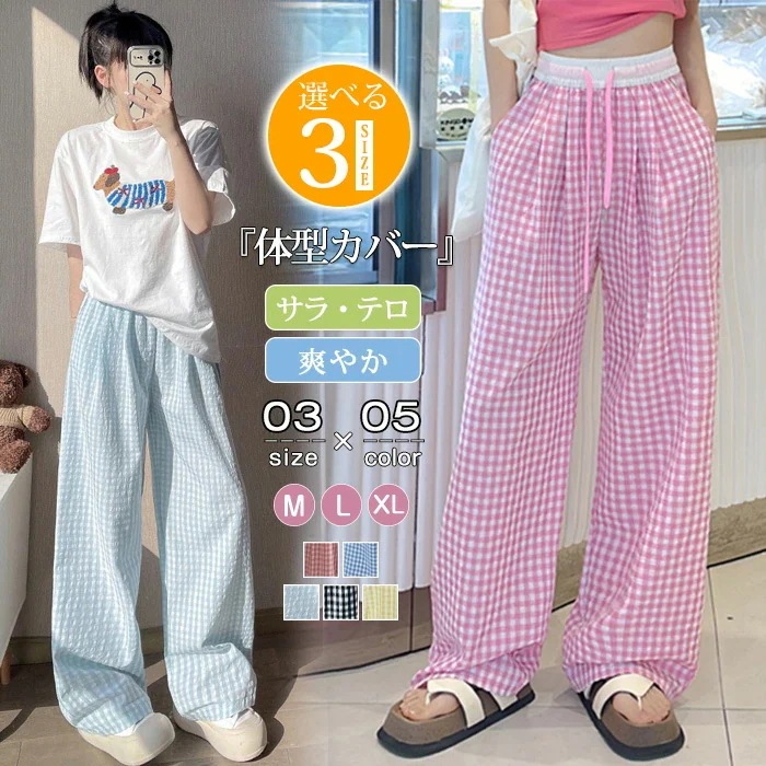 動画有り ワイドパンツ ボトムス ズボン ハイウエスト チェック柄 ガウチョパンツ ポケット付き ウエストゴム ロングパンツ 美脚 パンツ レディース ウエストゴム 楽ちん
