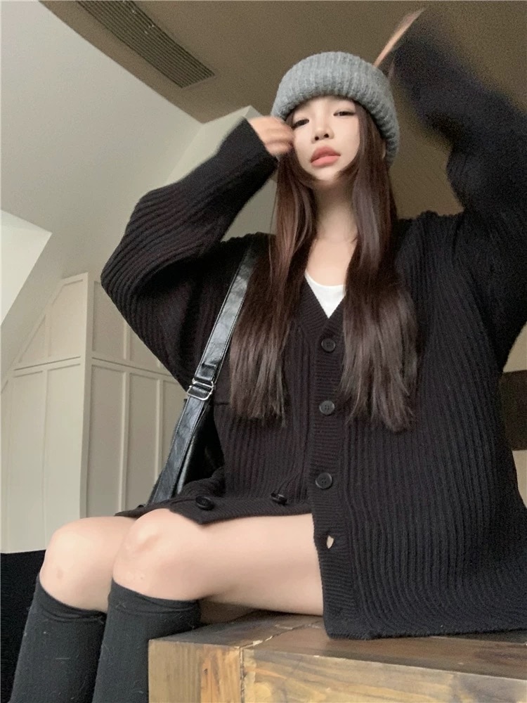 ポケット ニット カーディガン レディース 秋冬 黒 ミディアム 羽織 セーター 長袖 韓国ファッション カジュアル ゆったり ジャケット 可愛い 通勤 通学 着痩せ アウター コート
