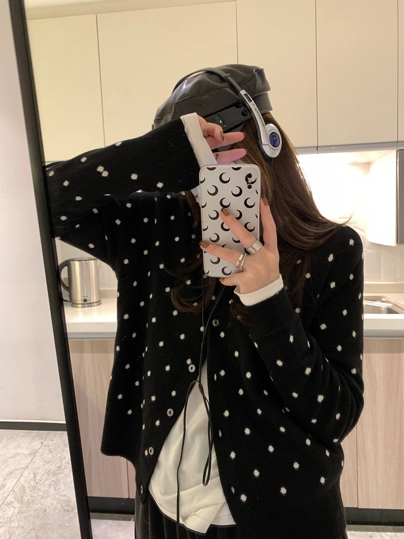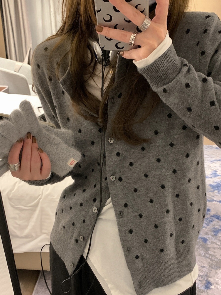 【2枚購入で200円 FF!】春用 ポルカ ドット パターン ニット カーディガン レディース 秋冬 黒 羽織 セーター 長袖 韓国ファッション ジャケット 通勤 通学 アウター コート