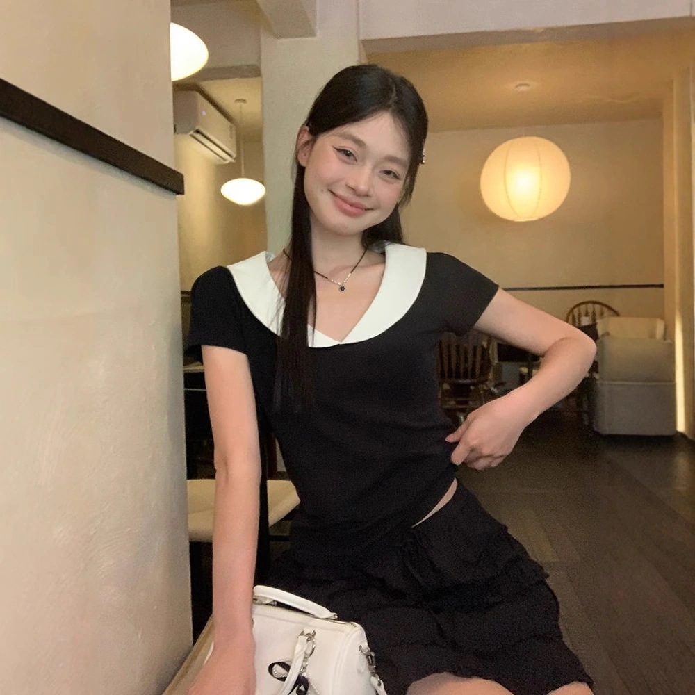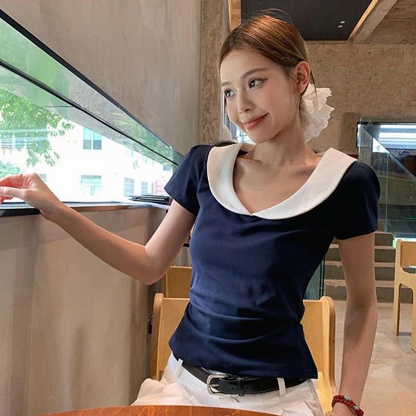 韓国風ネイビーカラーのポロネックストレートショルダーの半袖Tシャツレディース夏用スリムで可愛いトップス