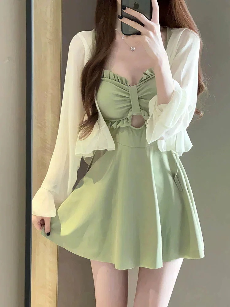 ラッシュガードビキニワンピース水着温泉入 体型カバー2点セット2025新型おしゃれ長袖控えめヌーブラ 【新作】2点セットレディース水着 UVカット長袖ブラウスをプレゼント