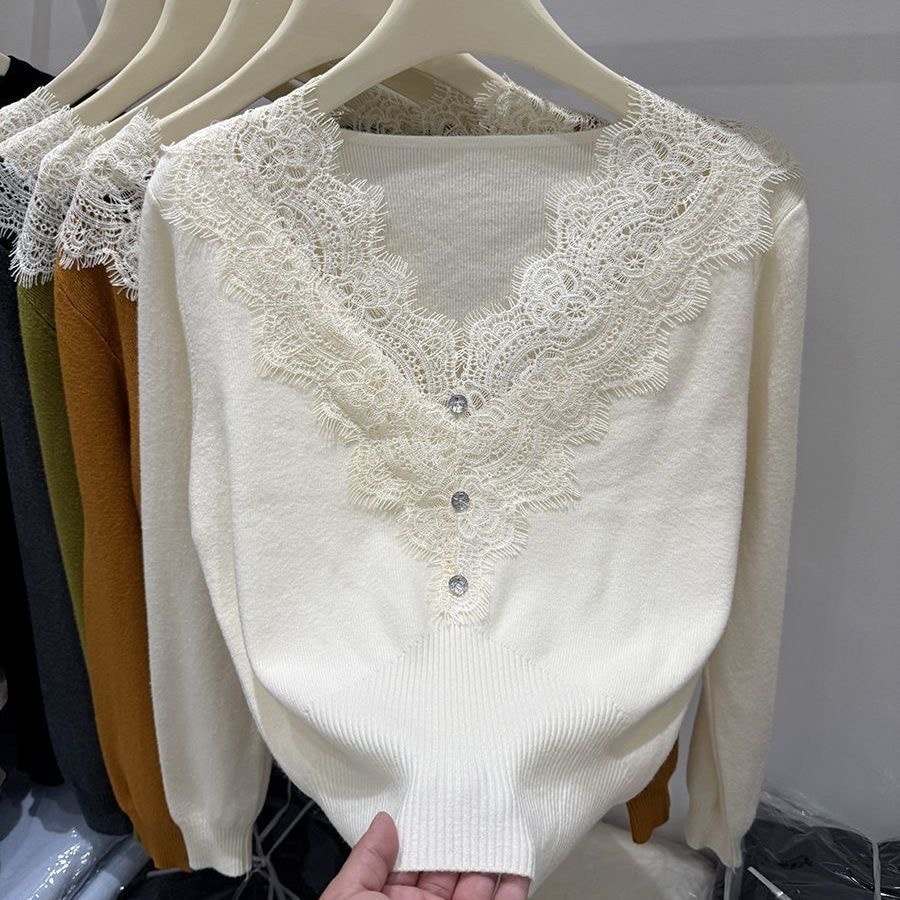 レースニットトップス Vネックニットセーター レース ベーシック 長袖 シンプル スッキリ カジュアル 綺麗め オフィス オフィスカジュアル インナー