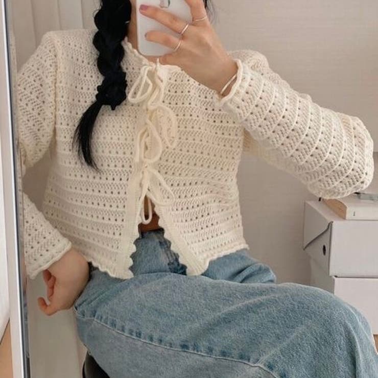 リボンニットカーディガン レディース クロップド ショート丈 丸襟 ボタン付き 透かし編み 韓国風 かわいい 春夏 重ね
