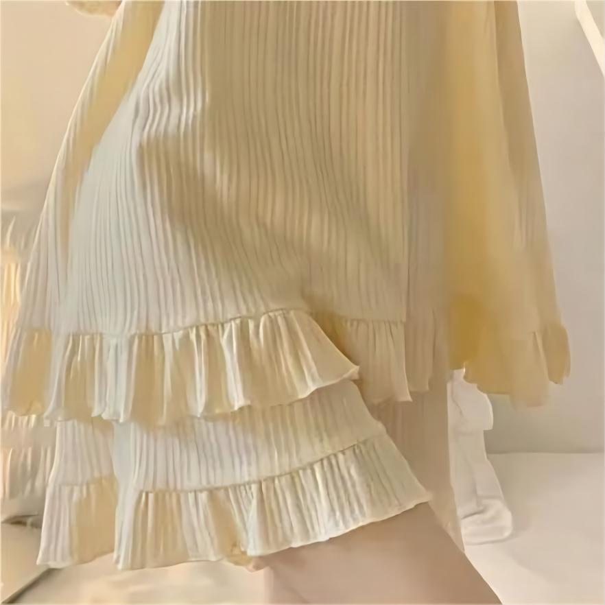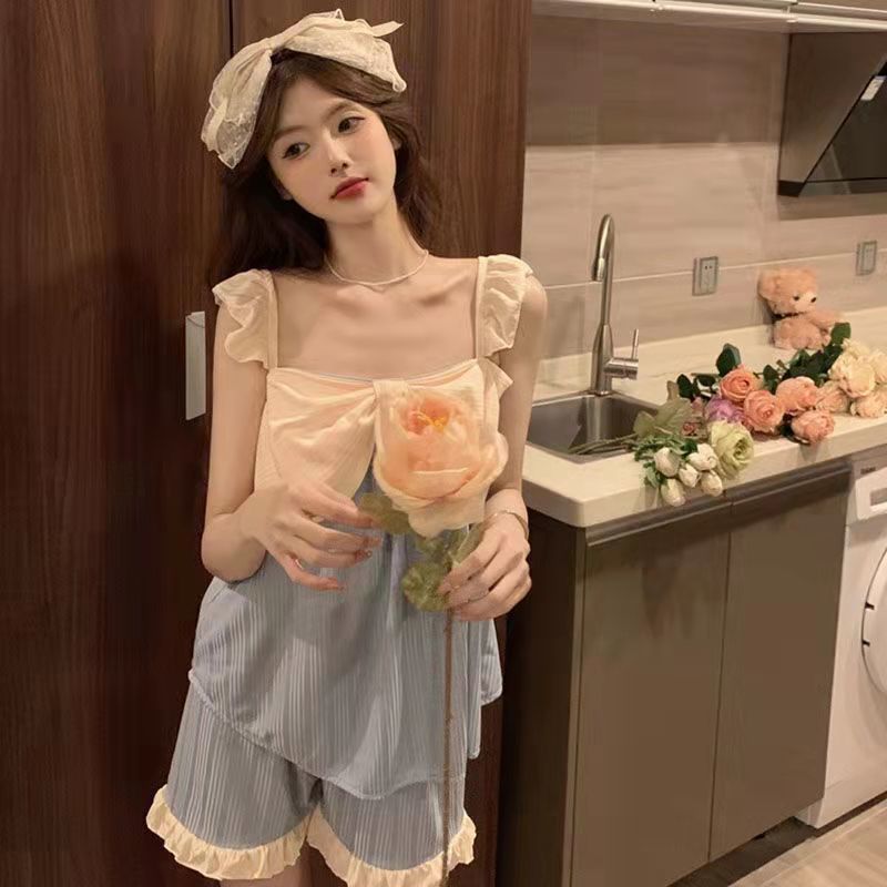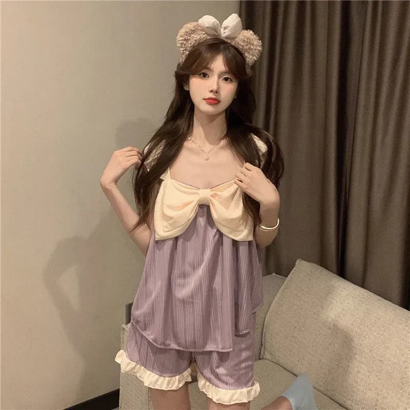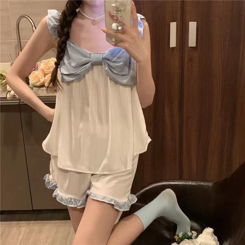 パジャマ女子夏の半袖半ズボンドールネックかわいい甘風リボン学生は部屋着スーツを外着できる