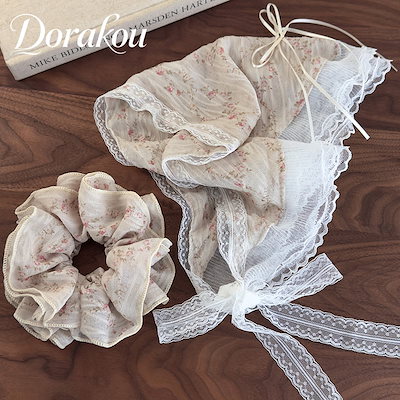 バブーシュカ シュシュ 2点セット 大判 レース 花柄 リボン ヘアアクセサリー レディース ガーリー 韓国 かわいい