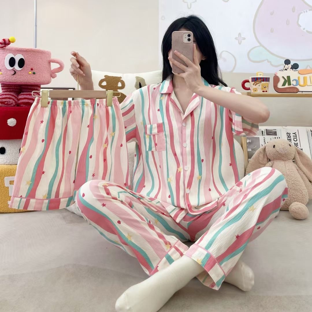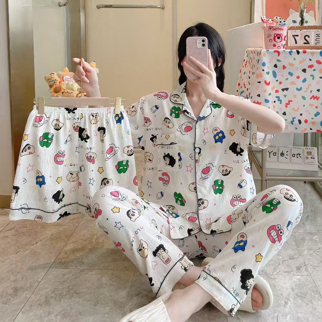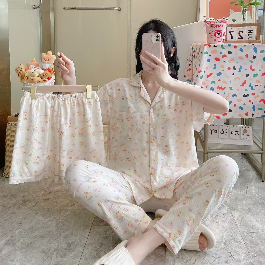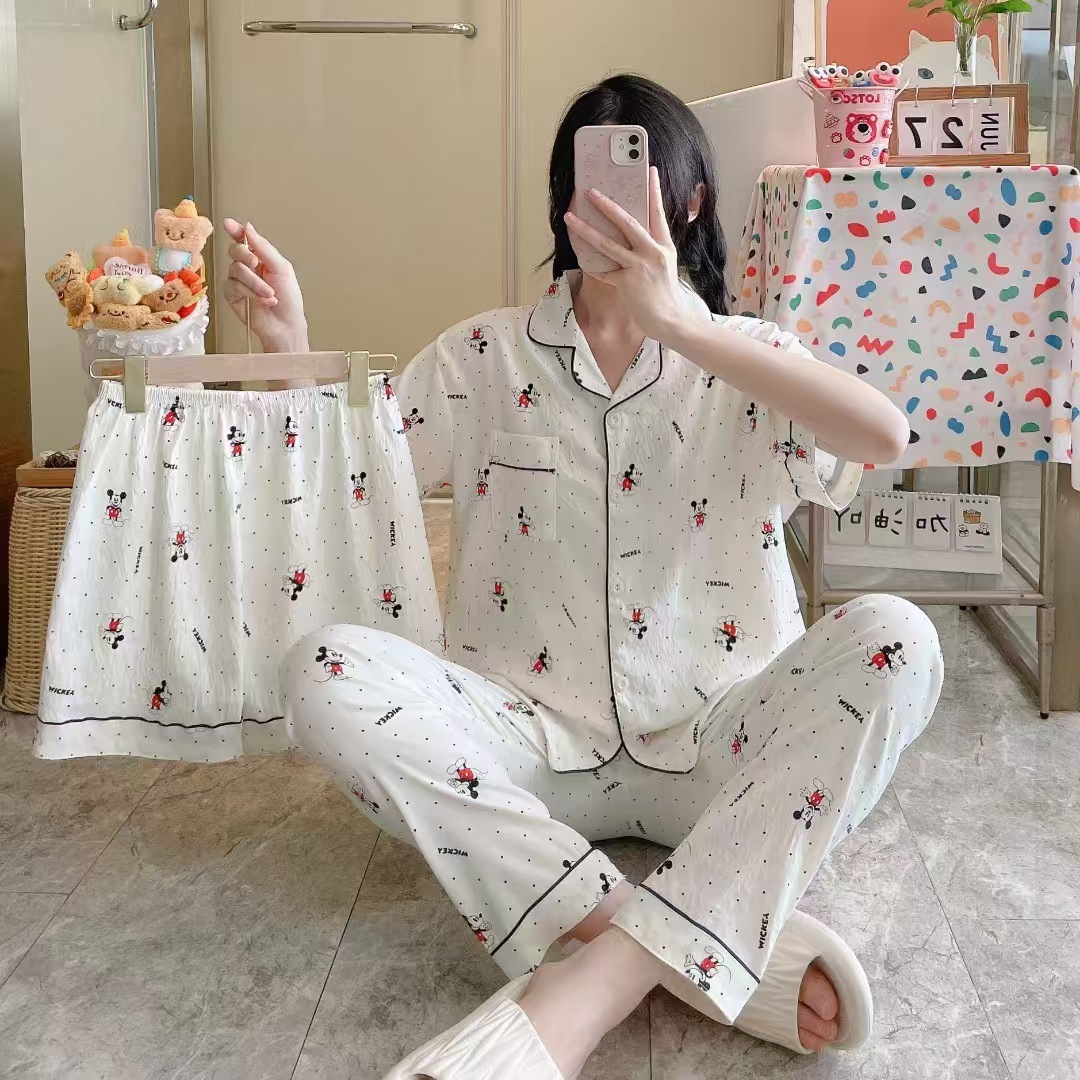 2026新作春夏 新作 プリーツ クラウドコットン パジャマ レディース 3点セット プリント スタンドカラー キュート ルームウェア セット キャラクター ルームウェア セットアップ 03