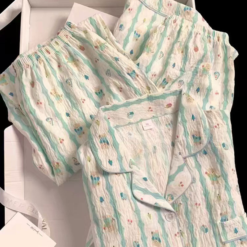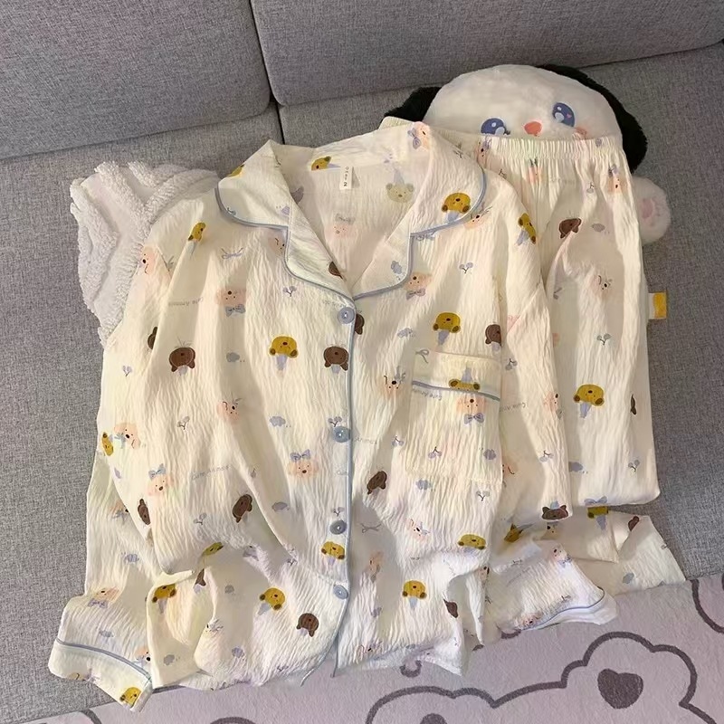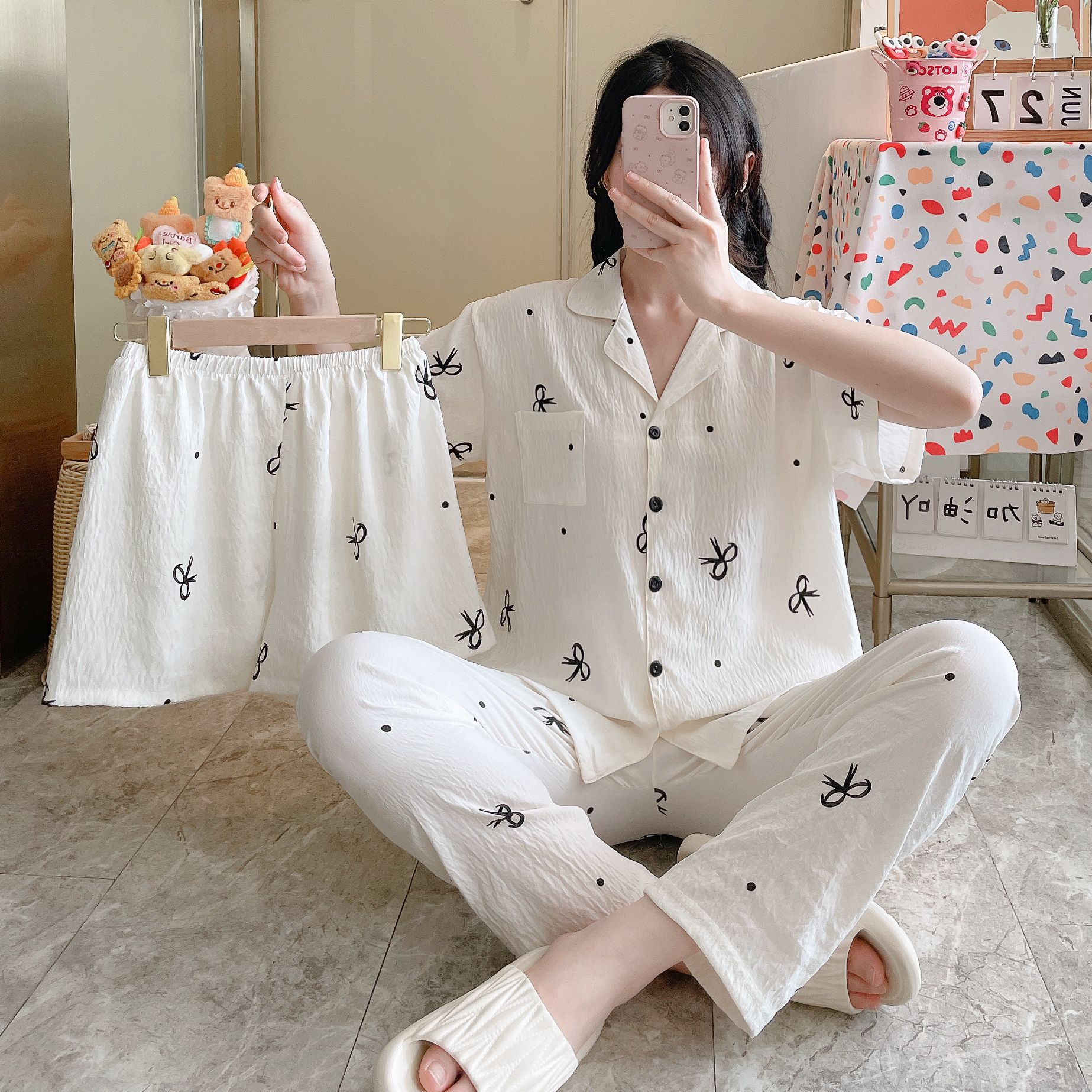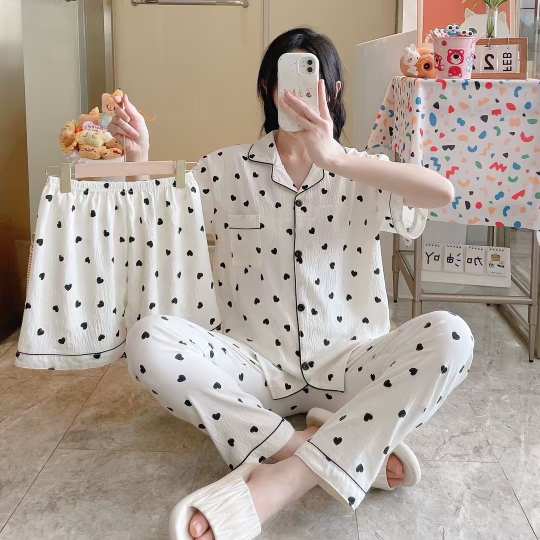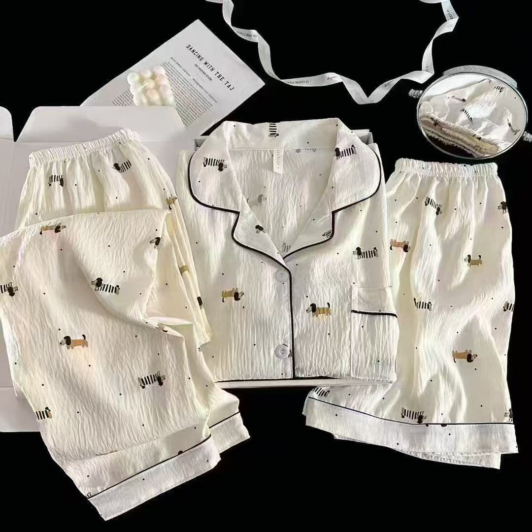 2026新作春夏 新作 プリーツ クラウドコットン パジャマ レディース 3点セット プリント スタンドカラー キュート ルームウェア セット キャラクター ルームウェア セットアップ 03