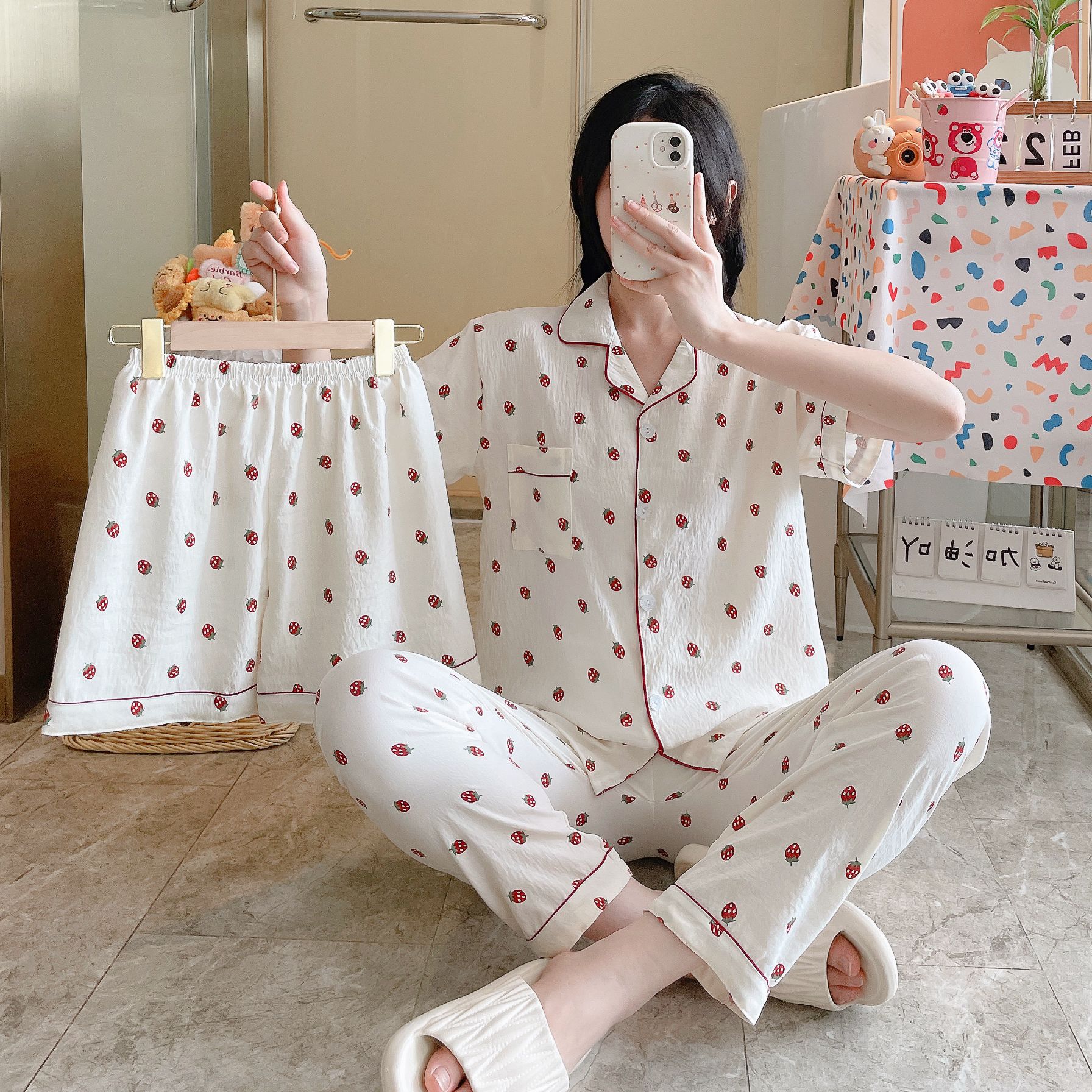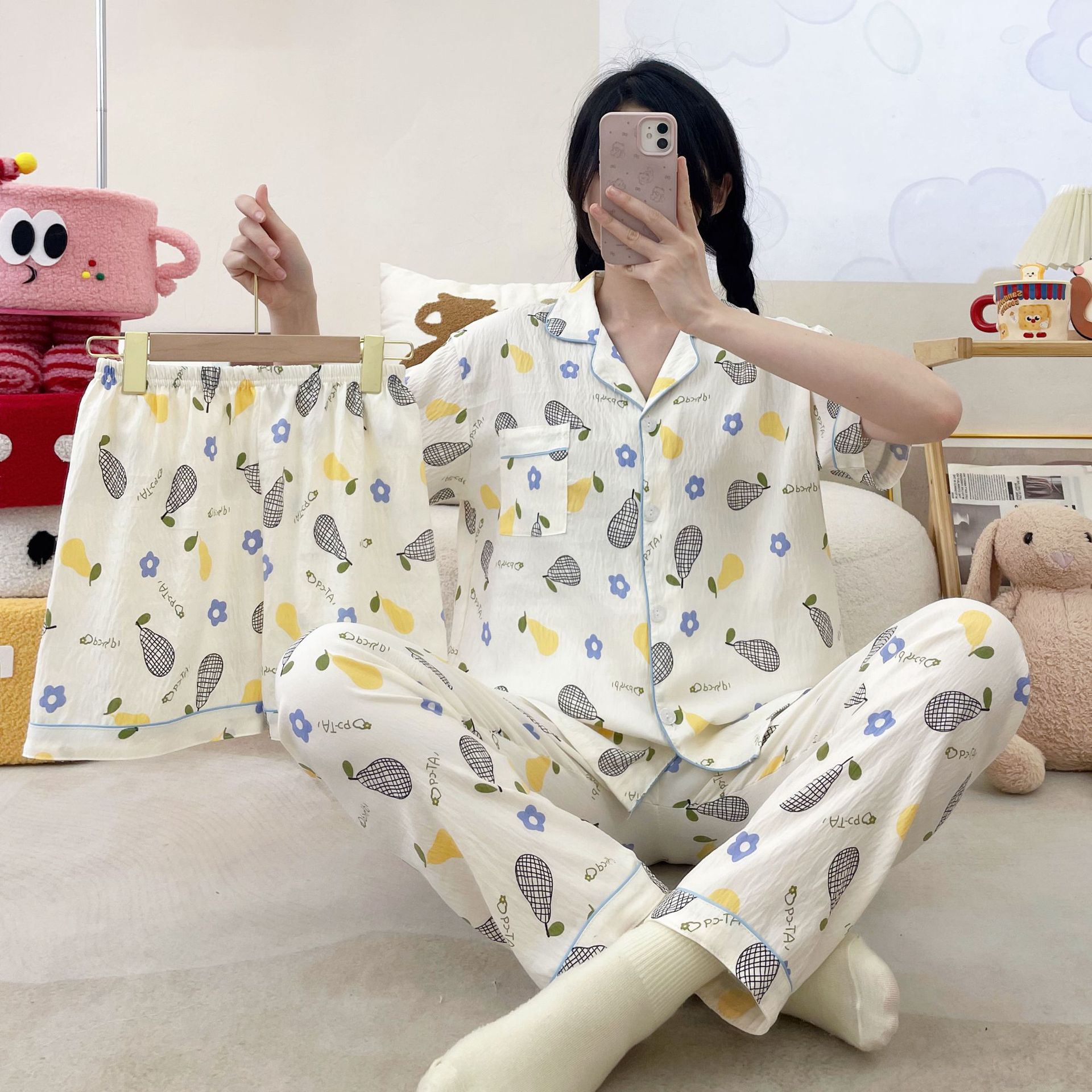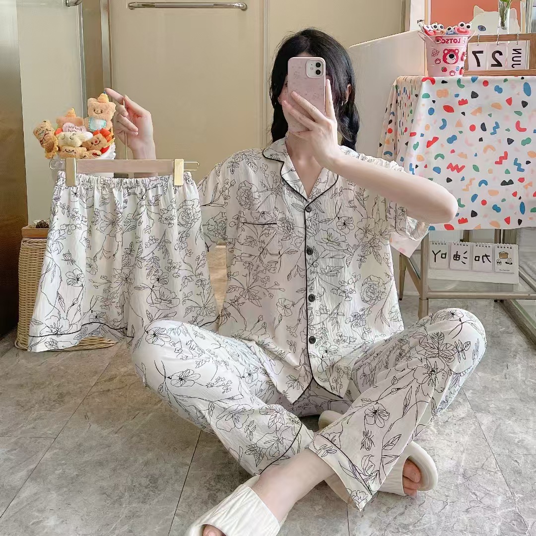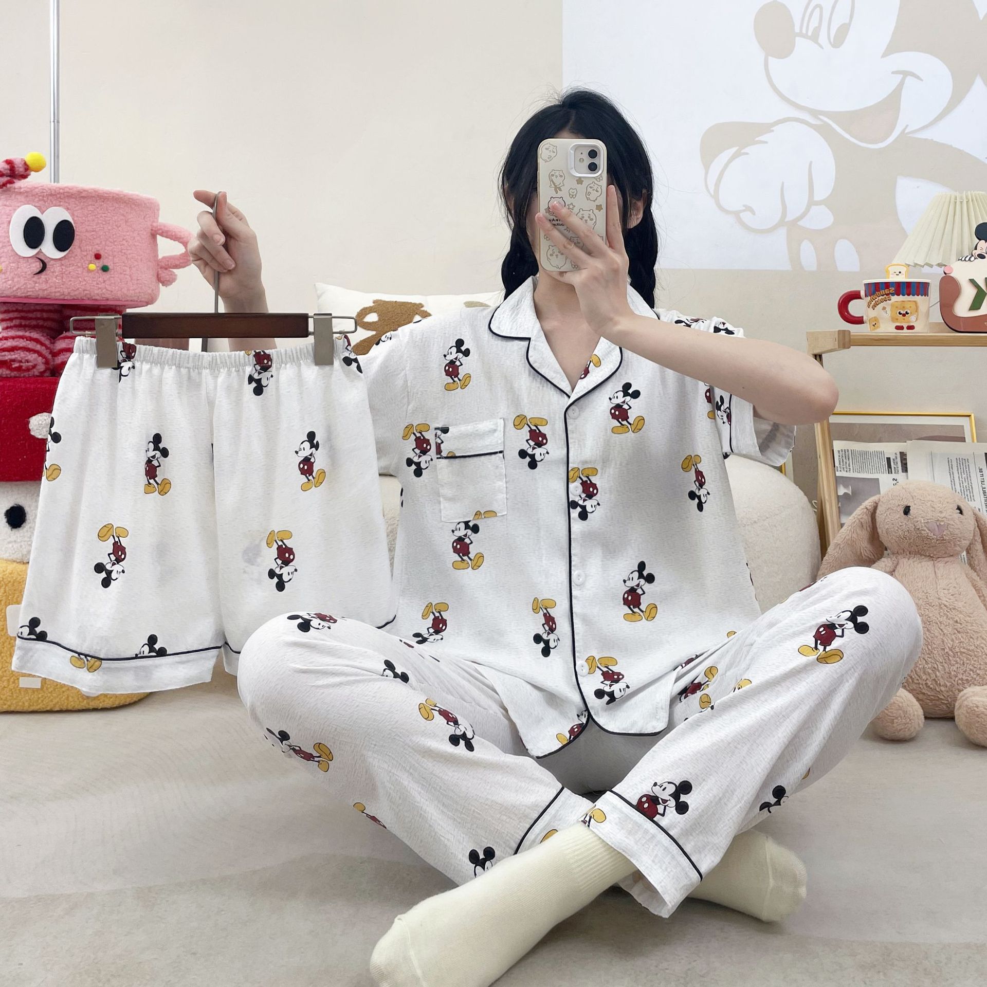 2026新作春夏 新作 プリーツ クラウドコットン パジャマ レディース 3点セット プリント スタンドカラー キュート ルームウェア セット キャラクター ルームウェア セットアップ 03