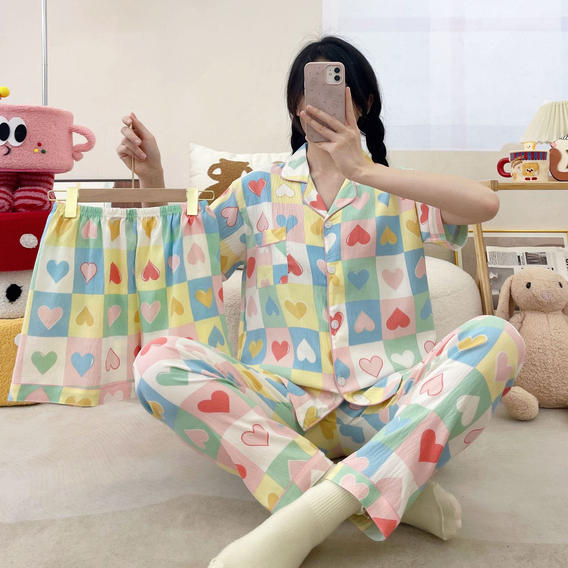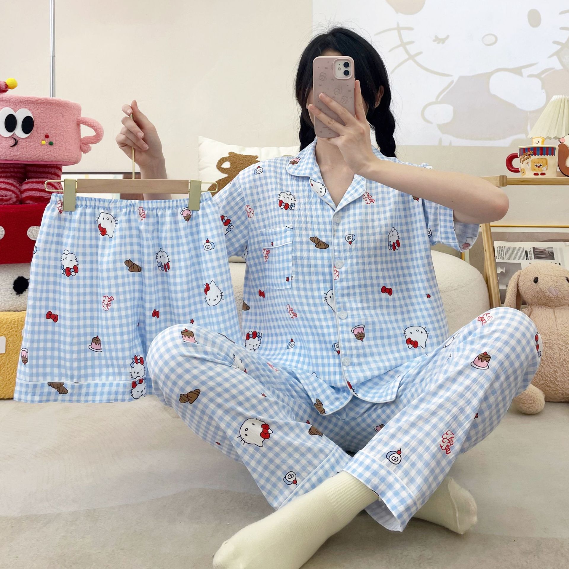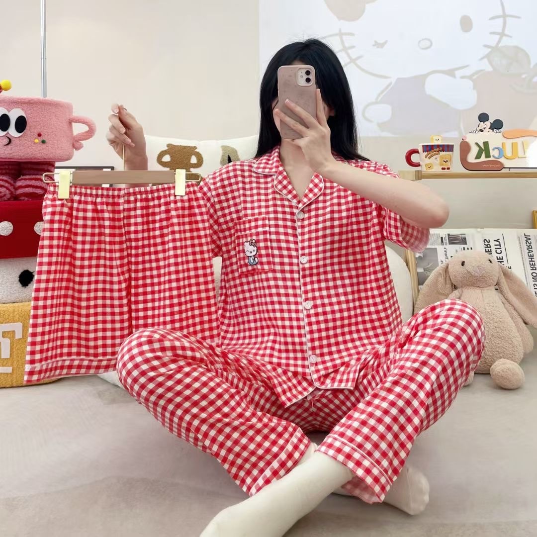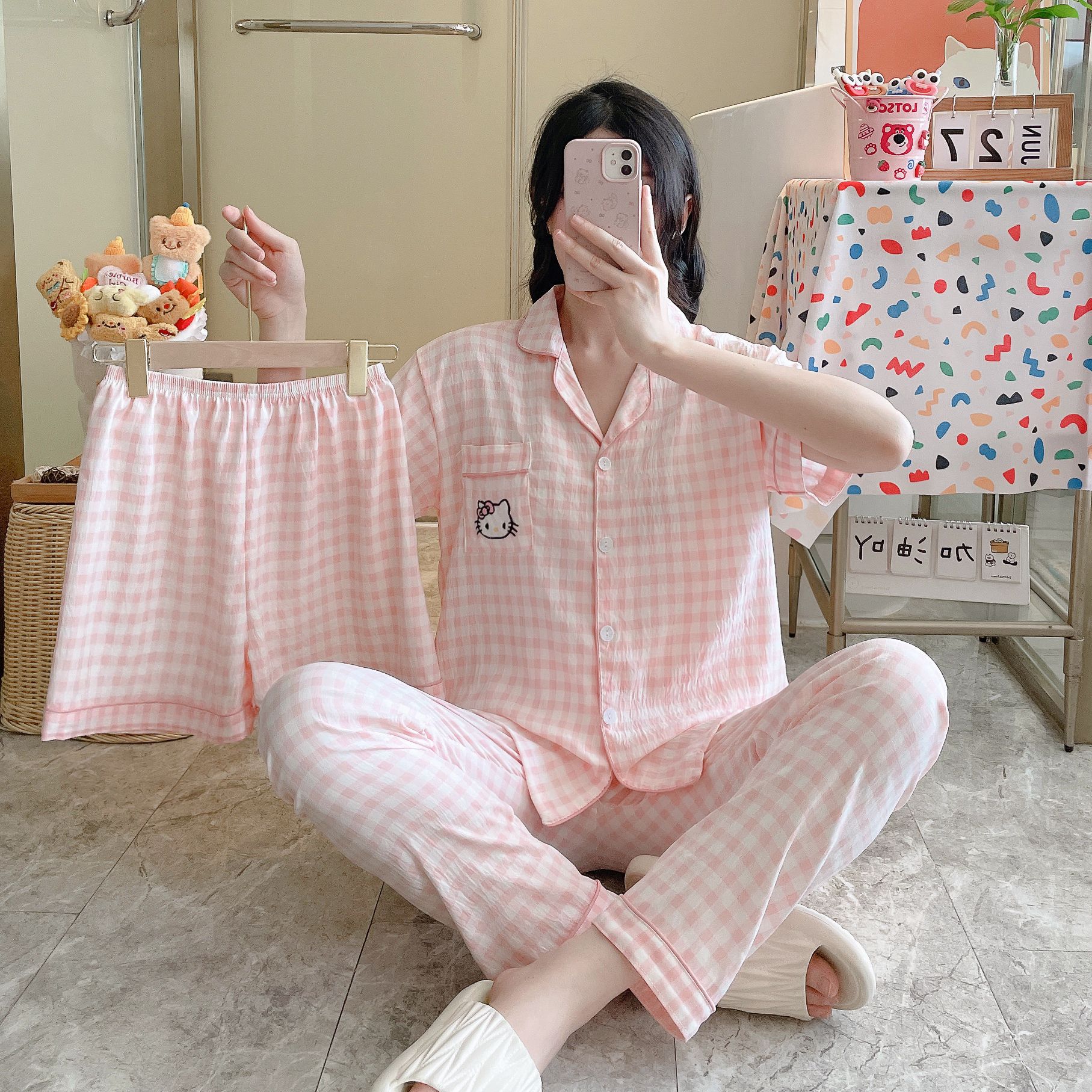 2026新作春夏 新作 プリーツ クラウドコットン パジャマ レディース 3点セット プリント スタンドカラー キュート ルームウェア セット キャラクター ルームウェア セットアップ 03