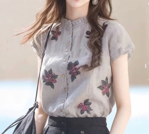 レディース 夏服 最新 フランス風 ヴィンテージ フラワープ 立襟 半袖ブラウス おしゃれ デザイナーズ スタイリッシュ カジュアルウェア シャツ