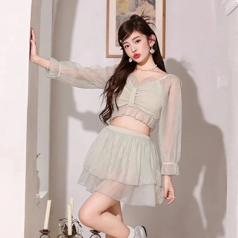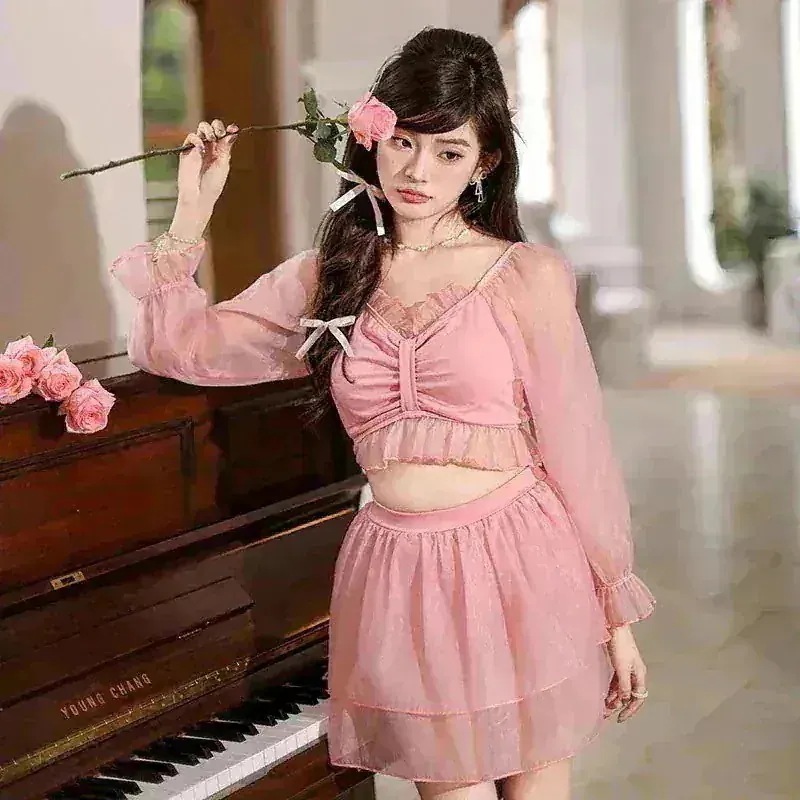 水着 レディース スプリット ツーピース 長袖 無地 ガーリー フリル スーパーフェアリー 温泉水着 水着セット 水着セット