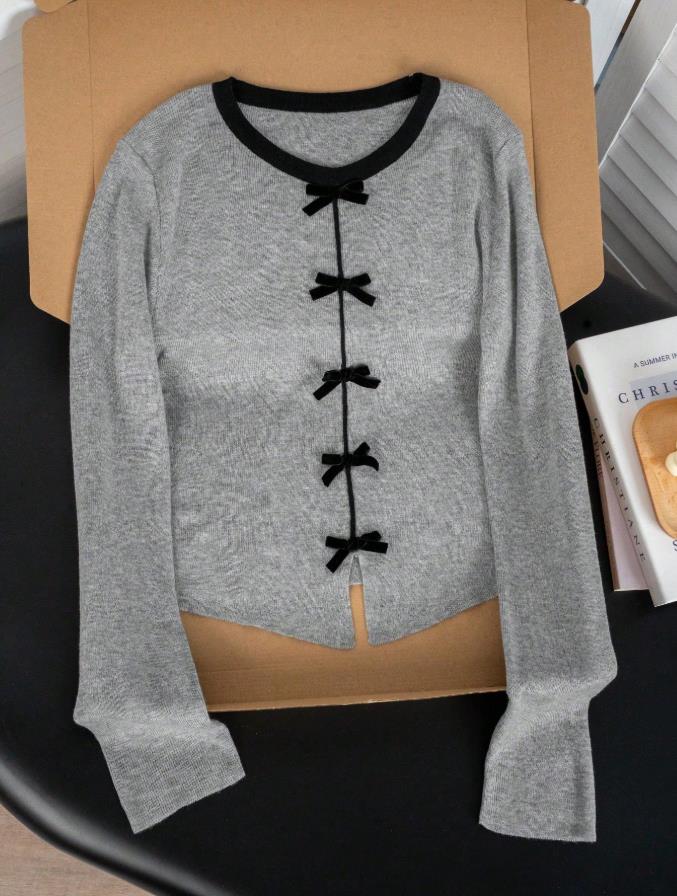 3Dリボン装飾 コントラストカラー クラシック スリムフィットセーター レディース秋/春デイリーデート通勤クリスマス長袖トップス