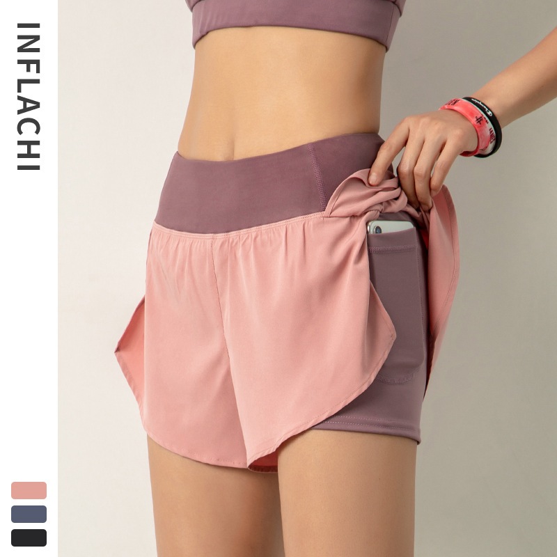 レディース 重ね着風 スポーツショートパンツ ランニング・フィットネス用 ハイウエスト 透け防止 リラックスパンツ 通気・速乾 ヨガパンツ