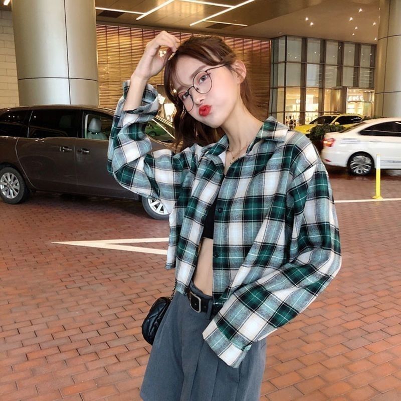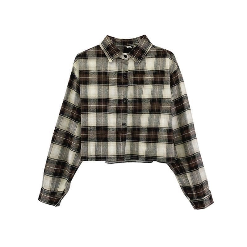 女性用 春秋カジュアルチェック柄クロップドシャツ