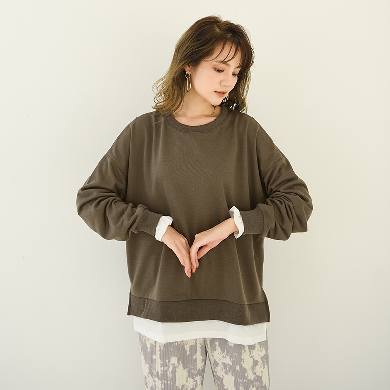 スウェットトレーナー トップス レディース 長袖 春秋 韓国風 無地 2 イン 1 重ね着風 クルーネック 長袖トレーナー ルーズシルエット 大きいサイズ